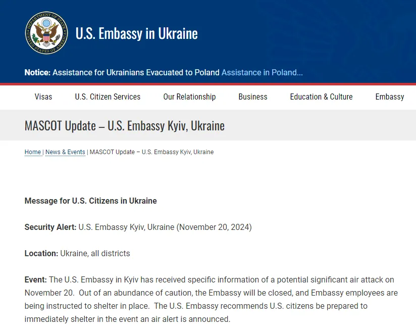 每经编辑:黄胜 央视消息消息,乌克兰基辅州军事管理局局长鲁斯兰·克拉夫琴科当地时间20日在其外交媒体上表现,基辅州从凌晨开始拉响防空警报,连续了高出11个小时。 乌防空队伍正在该地域开展工作,暂未有人员伤亡,有来袭无人机被击落,无人机碎片导致当地多所建筑受损。 当地时间11月20日,美国驻乌克兰基辅大使馆在官网上发出安全警报,称大使馆收到11月20日大概发生巨大空袭的信息。出于审慎思量,大使馆将关闭,使馆工作人员已被指示就地遁迹。 美国驻基辅大使馆官网发布安全警报(截图) 西班牙埃菲通讯社本日(11月20日)报道,西班牙驻乌克兰大使馆公布,由于“乌克兰各地遭空袭风险增长”,使馆本日将关闭,不提供服务。使馆还要求在乌的西班牙人采取安全步调,并确保随时能找到遁迹场所。另外,意大利驻乌克兰大使馆和希腊驻乌克兰大使馆本日(11月20日)也公布,因基辅面临袭击威胁,今日关闭,不对公众开放。 另外,11月20日,外交部发言人林剑主持例行记者会。有记者就俄罗斯国防部19日发布转达说,俄布良斯克州遭到乌军6枚美制导弹袭击一事提问。 对此,林剑表现,我们注意到了有关报道。当前形势下,各方应当保持岑寂克制,通过对话协商共同推动局面和缓,镌汰战略风险。在乌克兰问题上,中方的立场是一贯的明确的。我要强调的是,中方盼望各方推动和缓局面,致力于政治办理乌克兰危急的立场没有改变,将继承为此发挥创建性作用。 逐日经济消息综合央视消息 逐日经济消息 |