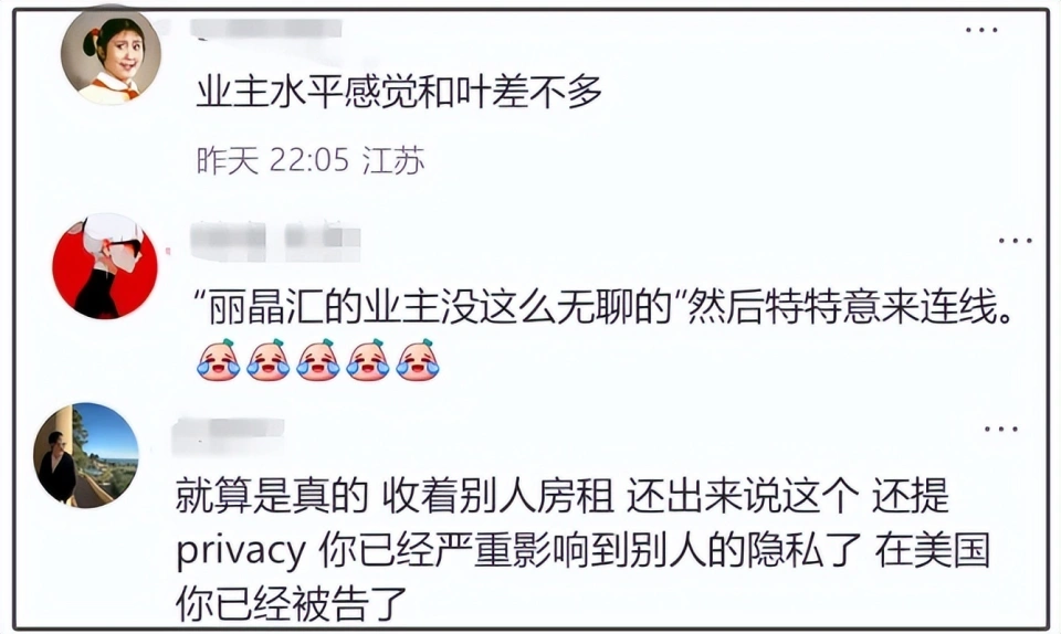 叶珂注销微博彻底退网后,爆料博主妖怪并没有信守答应不再锤她,而是使用了另一种方式锤。在直播间,妖怪与叶珂的房东业主连线了,业主贬低叶珂拉低他们档次,侵占了他们隐私,还喊话“叶珂什么时间脱离丽晶汇”,引发热议。 叶珂房东连麦后,妖怪起初误以为是叶珂邻人,随后她表示本身是叶珂业主,问“妖怪能不能让叶珂赶紧搬走”,妖怪表示“本身也不能把人赶走,让业主写联名让她搬走”,业主不耐烦地吐槽“丽晶汇业主没那么无聊,各人都在国外,谁在那边”。 而后,她表示那栋楼杨颖也住那边,小孩子也住那边,楼上楼下一栋楼,质疑黄晓明目的,吐槽“他搞后宫”,不应该住那边,弄得那边乌烟瘴气。 房东还表示原有的业主并不盼望着名,是有隐私的,有逼格的,不是网红大楼,吐槽叶珂每天拍东方明珠,不懂到底是家照旧配景板,泳池也拍,做SPA也拍,质疑岂非没住过公寓,不懂乡巴佬怎么回事,妖怪听后表明这些网红不是那么有钱,她们喜欢夸耀,也盼望以此得到更多的财富。 不少网友看到叶珂房东的连线也表示无语,以为业主和叶珂的水平差不多,房东言语里对叶珂的藐视绝不掩藏,却又言行不一,过重夸大隐私、不在乎,但是又舍不得房租和夸耀之心,某种水平上的内核是同等的。 而房东偶合般地能与妖怪连线吐槽也很不寻常,有网友质疑是炒作,毕竟“不无聊的业主”哪会精准连麦呢?自从叶珂与黄晓明公开恋情后,无论与她有关或无关的活动都被吐槽,可以说在互联网上吐槽她形成了默契,不外叶珂已经致歉和退网,她跟黄晓明的感情始终属于私人的事,不少网友也以为应该适可而止,不必把人“赶尽扑灭”。 至于叶珂与杨颖住一栋大楼的事变,黄晓明想必是不尴尬的,否则也不能恋情曝光这么久还没有做出改变。当初,叶珂与黄晓明恋情被扒缘故原由之一就是叶珂住宅配景与杨颖婚房同等。 被扒后,叶珂各种怼网友,先是否认本身住了杨颖婚房,之后表明称那一栋楼都是精装房,内设户型差不多一样,放言再造谣是婚房就告状。可以看出她对“杨颖婚房”的说法很介意,至于为何不搬走恐怕也有难言。 固然黄晓明不尴尬,但是外来人替他们尴尬了。在样式差不多的住宅里,杨颖和叶珂尚有差不多相似的玫瑰花场景图片,只是杨颖的花束更大,叶珂的数量分散,而此中有几束小型的玫瑰花装饰和设计雷同度很高,也是惹人遐想。 叶珂与黄晓明的感情是他们的私事,叶珂住在那里更是她的自由,如果房东及业主不满,可以采用更稳妥的方式办理,而不是拿着互联网大棒摆荡,盼望各人都能理智点。 本文未经授权严禁转载违者必究! |