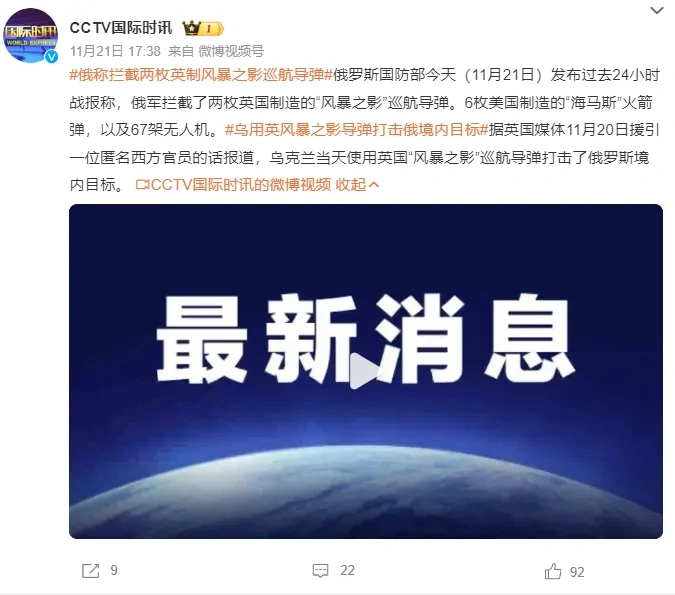据央视消息,本地时间11月21日晚,俄罗斯总统普京发表电话发言称,11月21日当天,“俄军对乌克兰军工企业举行了联合打击。攻击中俄军测试了没有搭载核弹头、代号‘榛树’的新型中程高超音速导弹”。该导弹可以或许以10马赫的速率打击目标,现在没有反导体系可以拦截这种范例的导弹。 普京夸大,俄罗斯正在研发中短程导弹,这是为应对美国在相干地域生产和部署此类导弹的筹划。关于未来中短程导弹的部署问题,将根据美国及其卫星国的行为做出决定。 普京表示,“西方导弹打击俄罗斯后,俄乌辩说具有了环球辩说的性子,局面正在进一步复杂化。如果辩说发生任何形式的升级,俄罗斯将果断采取对等的反击步调,以维护国家安全和主权完备。” 俄罗斯联邦安全聚会会议副主席梅德韦杰夫本地时间11月21日晚也在交际媒体发布视频,称“这是一次高超音速弹道导弹打击”。 俄罗斯联邦安全聚会会议副主席梅德韦杰夫发布的视频截图 别的,俄罗斯总统消息秘书佩斯科夫当晚在答复媒体关于俄罗斯为什么没有提前转达“榛树”导弹发射的问题时表示,俄罗斯无须向任何方面提前转达,由于发射的仅仅是中程导弹,俄罗斯没有提前转达这种导弹发射的任务。 当天晚些时间,俄罗斯联邦委员会副主席康斯坦丁·科萨切夫通过交际媒体表示,俄罗斯总统普京发表的声明针对的是那些以为利用美英导弹打击俄方目标不会招致回应的人。继承利用西方国家的导弹打击俄罗斯将把这些国家本身“置于回手之下”,也就是说,“谁允许乌克兰利用远程打击武器,谁就有可能成为俄罗斯回手的对象”。 乌克兰总统泽连斯基本地时间11月21日晚在交际媒体发表声明,以为普京的发言“表明俄罗斯认可已采取了再次升级战役的步调,扩大了辩说的范围”。 乌克兰交际部发言人泰希在普京发表电视发言前表示,乌克兰交际部已就“俄罗斯利用新型武器对乌克兰第聂伯罗市发动打击”一事向合作搭档转达了情况,并已与联合国、北约等举行打仗。除了正式的号令和声明之外,乌克兰敦促合作搭档和盟友采取具体办法,即加强乌克兰的防空防御,为乌克兰提供可以或许拦截此类导弹的防空体系。他表示,“天下上存在如许的防空体系,是时间将其交付给乌克兰了。” 据@CCTV国际时讯,俄罗斯国防部11月21日发布已往24小时战报称,俄军拦截了两枚英国制造的“风暴之影”巡航导弹。6枚美国制造的“海马斯”火箭弹,以及67架无人机。 据英国媒体11月20日援引一位匿名西方官员的话报道,乌克兰当天利用英国“风暴之影”巡航导弹打击了俄罗斯境内目标。 编辑|孙志成 盖源源 校对|赵庆 逐日经济消息综合自央视消息等 逐日经济消息 |