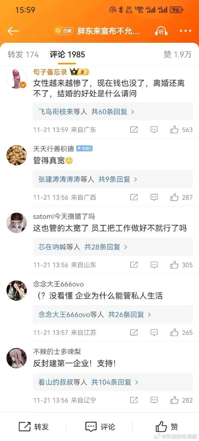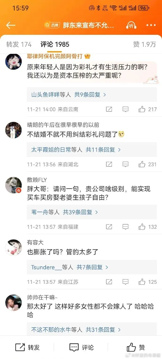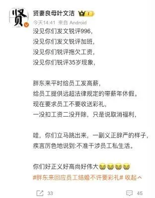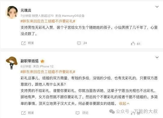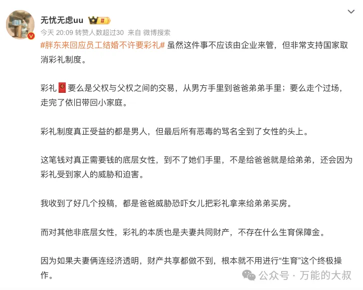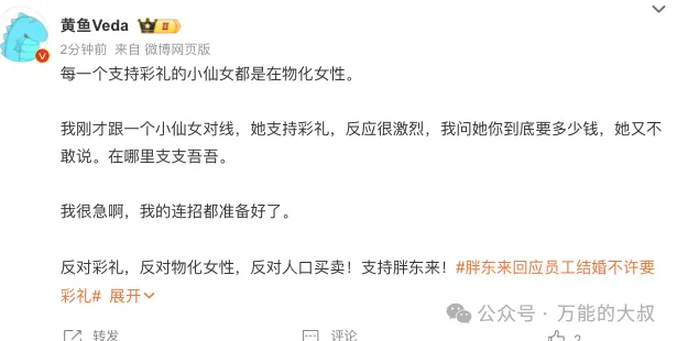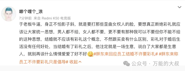 第二波是“网友反对媒体反对”,听着像绕口令…… 网友1:没见你们发文锐评996 网友2:媒体对营商环境的操控结果相称显着,胖东来正在遭遇空前的网暴压力 第三波是“男女对立”,走向“失控”! 由于“彩礼”这个话题背后,是男方女方。 这个议题,已经逾越一个企业能蒙受的话题。 大叔给你摘一些在上述微博留言区的高赞批评: