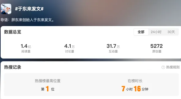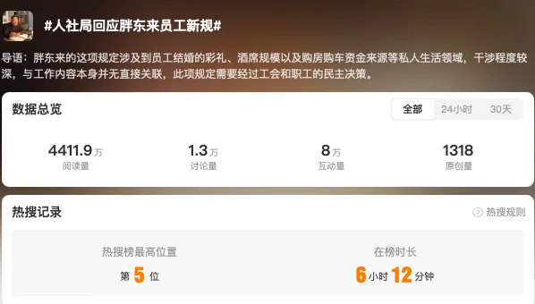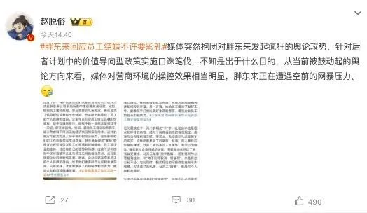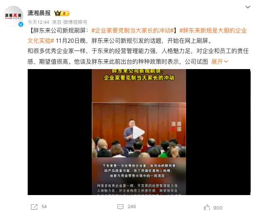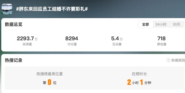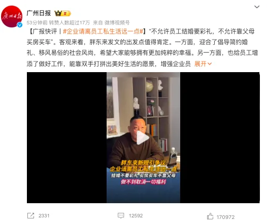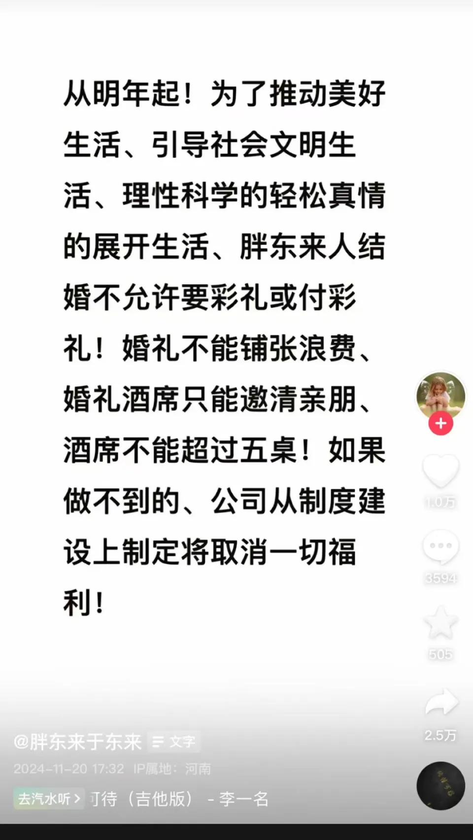 “果然夫君只为夫君思量。”——某微博网友。 这两天,两位老板,刷屏了。 一位是钟睒睒。公开炮轰张一鸣。 “首富”征战,网友只有吃瓜,很难共情“首富被网暴”,也注定这波舆情很难翻盘,钟还捎带自黑了一把“绿瓶农民”…… 大叔本以为农民山泉这次有“高人”。如今看,从首富盼望网友能共情本身这个视角,还是钟老板本身在主导。 另一位则是于东来。 他本身在抖音上更新了一个图文,对胖东来员工提出新要求: 来岁起,完婚不能要(付)彩礼,酒菜最多5桌,做不到就取消齐备福利。 由于涉及到“彩礼”,这个中国人最敏感的话题之一,瞬间,喜提5个热搜! 这次舆论方向转变,很故意思: 第一波是“媒体反对”。 以传统媒体为主,好比: