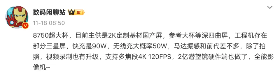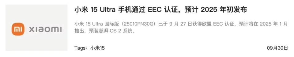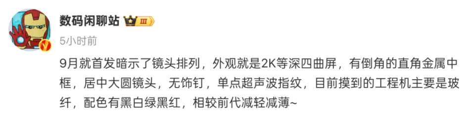 已知大概率会用到的设置,包括骁龙 8 至尊版处置惩罚器、2K 120Hz 等深四曲面屏幕、单点超声波指纹、靠近 6000mAh 的大电池、90W+50W快充、USB 3.2、IP68…… 哦对,尚有个小细节。 总的看下来,机哥感觉这代 Ultra 的升级点照旧蛮多滴。 像是全新的镜头方案。 周边设置上,超声波和大电池也齐活儿了。 小米 15 Ultra 说不定又是一代钉子户。 除了小米 15 Ultra 以外。