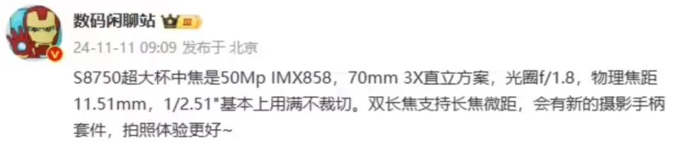 不绝不但强调堆料。 而是关注镜头光学素质、色彩影调的小米。 那么标题来了。 小米接下来的 15 Ultra,还会对峙上一代的副摄方案,实现 3*858 传三代的壮举吗? 毕竟是继 MIX 之后,小米高端市场末了的顶梁柱选手,指定是不会让友商大杯以下犯上。 影像设置,会在这个版本迎来彻底重做。 好比,这次虽说依然照旧四摄组合。 但超长焦,也用上了 vivo X100 Ultra 同款两亿像素潜望,传感器不出不测照旧三星 HP9。 传感器面积大、像素多,天赋就是拿来裁切望远的圣体。 加上小米 15 Ultra 做到了更远的原生焦段,以及「Xiaomi AISP」算法加持。 焦段过于靠近的 3.2X,自然也就没啥生存的必要了。 阿米这次给换成了一颗 5000 万像素,2X 光变小中焦。 具体为,换回了IMX858 3X 直立长焦,而且也支持长焦微距。 毕竟超大杯都上一英寸主摄了,2X 用主摄无损裁切就行,确实没必要再上个 2X 镜头徒增空间。 别的,这次阿米应该是预备在人像上发力。 3X 小长焦,加上有新的人像算法加持,主打一个拍人更美。 至于主摄。 之前隐隐约约有消息传出,某超大杯不会上一英寸主摄,不少机友在推测是上了四摄位置不敷的小米。 着实,大伙照旧想多啦。 固然具体型号这会儿还不知道,但小米 15 Ultra 不但要用一英寸,而且还会定制新的硬件模组。 当然,代价嘛。 就是反面的镜头模组,大概会变成如许。 低情商,镜头模组叒要不可制止地变大变凸。 高情商…… 后续原生焦段大概会略微调解,好比默认裁切一下之类的。 但四摄设置,基本就如许了。