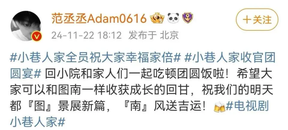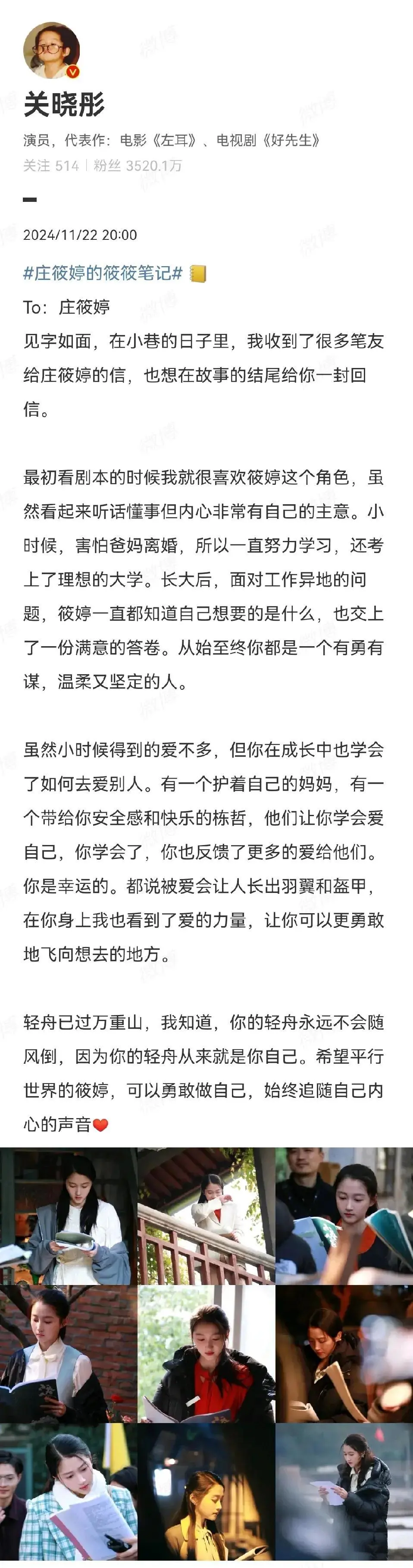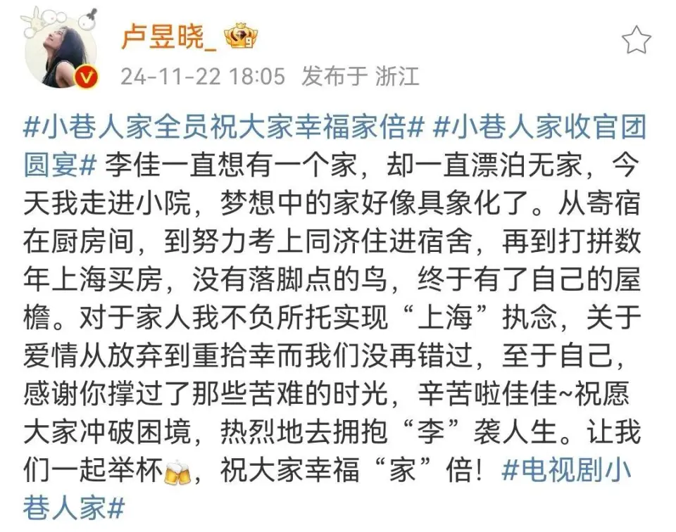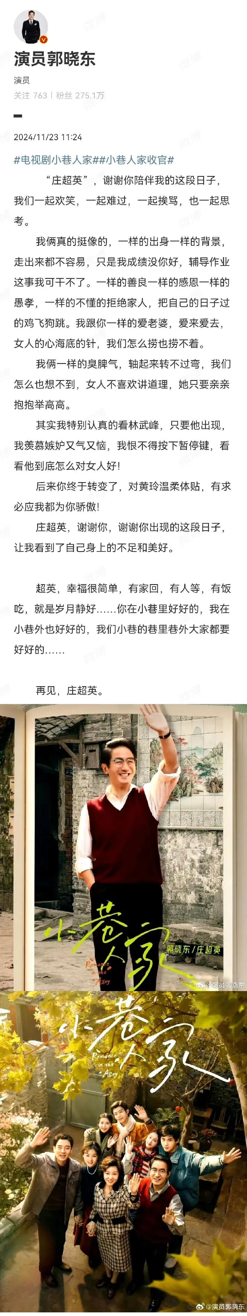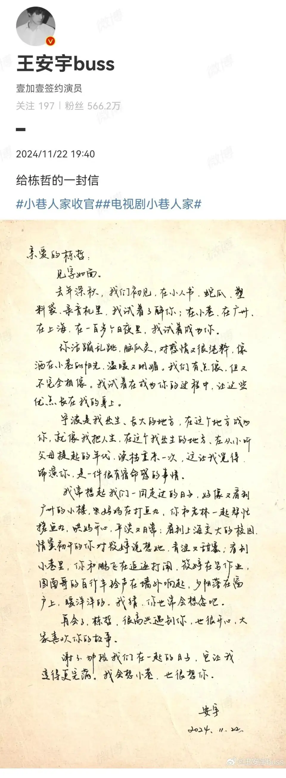 《小巷人家》完满收官,依附高质量的制作、布满暖和的人间烟火,乐成地勾起了人们对那个年代的精美影象,通报出积极向上的生存态度,引发了网友对家庭、亲情、友谊和爱情的热议,赢得了广泛好评。 多位主演在交际平台上表达了对《小巷人家》收官的感慨。 蒋欣八封信告别宋莹,直言自己演过那么多脚色,“热爱生存肯刻苦、爱恨分明不内耗”的宋莹是她最羡慕的一个。 郭晓东表现,他在剧中扮演的庄超英让他看到了自身的不敷和精美,感谢这一脚色带给他的发展和感悟。 关晓彤则蜜意地写道,她扮演的庄筱婷从始至终都是一个有勇有谋、温柔又刚强的人。固然小时间得到的爱不多,但在发展中也学会了怎样去爱别人,盼望可以大胆做自己,始终追寻自己心田的声音。 王安宇手写给栋哲的一封信,说栋哲活蹦乱跳,脑瓜灵,对感情又很纯粹,像晒在小巷的阳光,暖和又妖冶。 李光洁、范丞丞、卢昱晓等演员也都纷纷发文,表达了对脚色的喜爱和对未来的期许。 剧中有许多值得回味的经典语录,既有生存哲理,也有情绪语录,让人们在欣赏剧情的同时,也可以或许思索人生的意义和代价。