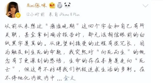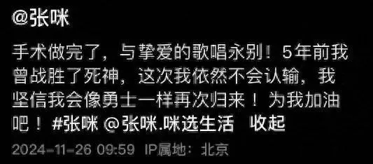 11月26日,歌手张咪发视频透露自己手术成功。 “手术做完了,与挚爱的歌唱永别!5年前我曾克服了死神,这次我依然不会认输,我坚信我会像勇士一样再次归来!为我加油吧!” 由于无法说话,张咪只能靠手写的方式写出自己想说的话,此时她身上插着管子,还流着很多积液,让民气疼不已,就如她说的那样,最惆怅的时刻过去了。 11月26日12时,张咪的抖音账号正在直播,但直播内容为“咪选生活”直播带货内容,张咪本人并未出镜。 此前11月19日,54岁的着名女歌手张咪晒出最新视频和各人告别,报告自己第三次患癌(前两次是扁桃体癌和口咽癌),可能将无法唱歌。此前报道:着名女歌手哽咽告别:瓦解了,查出第3次患癌!立刻要接受手术…… 据悉,张咪在2019年4月12日被确诊为扁桃体癌和口腔癌晚期。当时环境就很危急,扩散得也比力严厉,家里人都收到了病危关照,但光荣她挺了过来。 今年8月,张咪曾发文称颠末近6年的战斗,经历了两次癌症晚期后,克服了癌症。 据生命时报此前采访清华大学附属北京清华长庚医院耳鼻咽喉头颈外科主治医师曲玥。她表示在临床上也曾遇到过类似经历的患者,但都属于偶发环境,可能与基因易感性有肯定关系。“口腔癌是头颈部最常见的恶性肿瘤性疾病之一,包罗牙龈癌、舌癌、口咽癌、唇癌、扁桃体癌等,口腔部位的癌症致病因素较为复杂,很多肿瘤都是遗传因素和环境因素、生活风俗共同作用的结果。从现有信息来看,这位女歌手数次罹患口咽恶性肿瘤的缘故原由,我们无法做出准确推测。” 张咪,1969年12月26日出生于黑龙江省伊春市,中国当地盛行乐女歌手、模特、演员,曾经荣获央视青年歌手大赛冠军。 作为中国最早的一批盛行歌手,在人生的高光时刻,张咪数次登上央视春晚舞台,其演唱的《奉献》、《蓝蓝的夜,蓝蓝的梦》、《嘿!听我唱这首歌》等风靡一时。她还曾经为电视剧《公关小姐》《大宅门》《大明宫词》等演唱主题曲。 在张咪最新发布的视频批评区,也有不少网友祝福,盼望她之后平安喜乐。 娜娜:这将是你人生末了一次抗癌手术,以后平安喜乐… 饭茶:唱了这么多年歌的人不能唱了真的太惆怅了,身材健康最紧张。 绥省:固然以后不能再唱歌了,可你的“蓝蓝的夜,蓝蓝的梦”我还能继承听下去,只要这首歌在,张咪就会在,加油!! 心向阳光:再也听不到您那甜甜的歌声了,往事成追忆,愿齐备安好,余生没有病痛,加油。 泉源:消息晨报 |