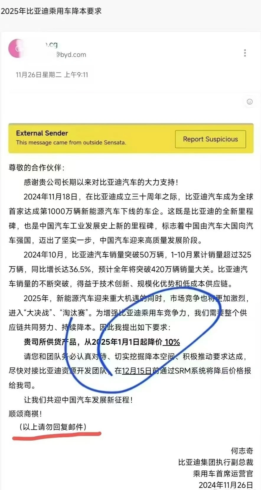 三言科技 11月27日消息,昨日,一封主题为《2025年比亚迪乘用车降本要求》的邮件流出,邮件署名为比亚迪团体实验副总裁、乘用车首席运营官何志奇。 邮件内容称,2025年,新能源汽车迎来巨大时机的同时,市场竞争也将更加激烈进入“大决斗”、“淘汰赛”。为加强比亚迪乘用车竞争力,比亚迪必要整个供应链共同努力、持续降本。因此,比亚迪要求合作伙伴所供货产物,从2025年1月1日起贬价10%,并在本年12月15日前通过SRM体系将降子女价报给比亚迪。 据媒体报道,对于上述邮件内容的真实性,比亚迪方面回应称:“正在核实”。 |