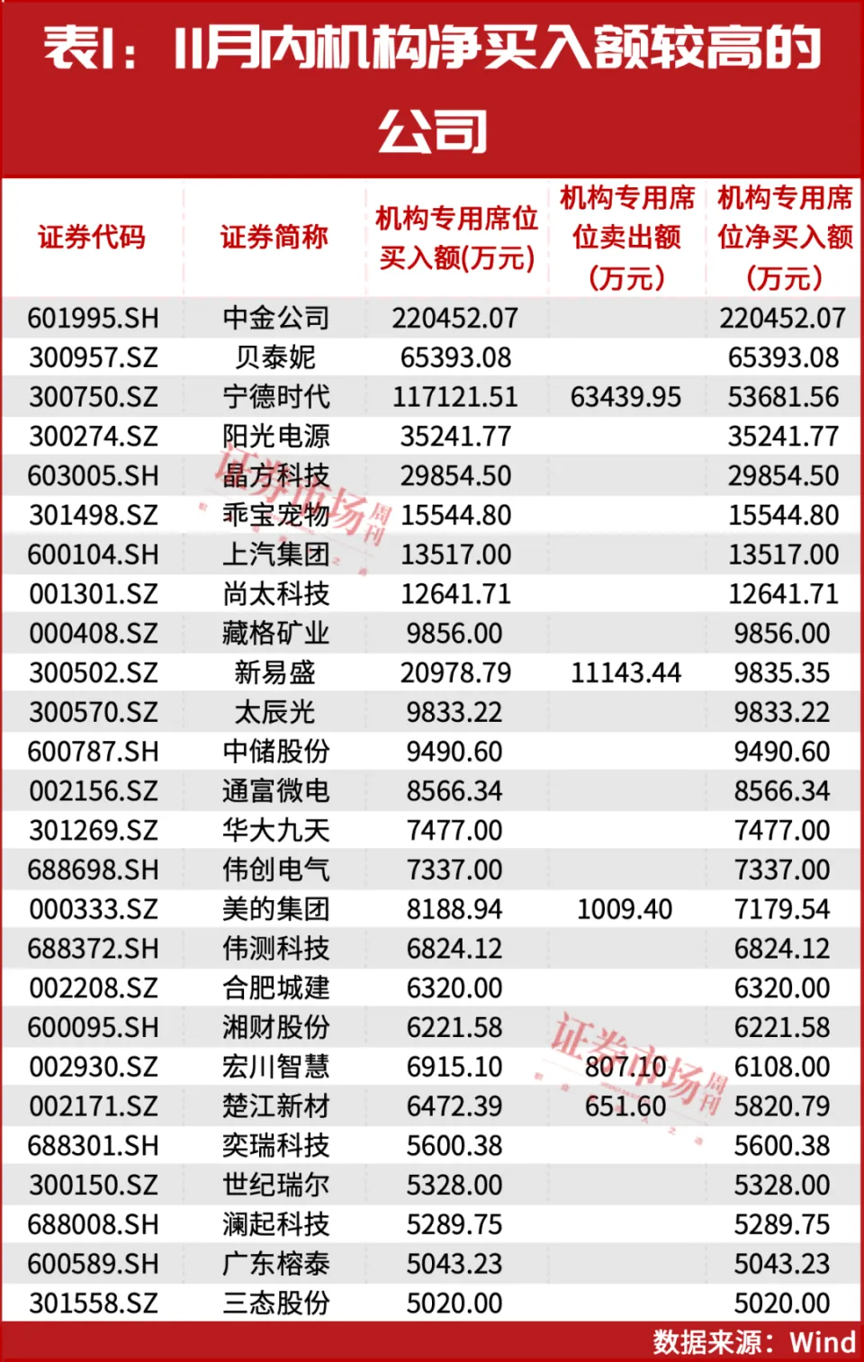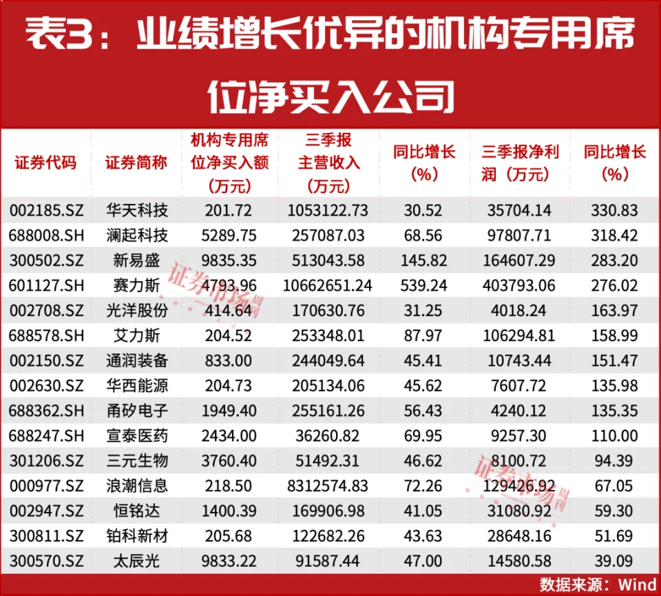 文丨尚扬 周三早盘,A股低开低走,各大指数一度相继下行。 但在10:08左右,在TMT、券商、白酒等板块动员下,指数开始止跌回升 ,创业板指涨势最为显着,全天涨幅达2.73%。 固然11月以来市场整体体现欠佳,但 机构资金也在连续通过大宗生意业务市场加仓,月内净买入金额已近69亿元 。 机构席位 通过大宗生意业务市场连续买进 11月以来,A股指数先扬后抑,自11月8日开始,市场整体连续震荡回调,现在上证综指已累计下跌近5%。但观察大宗生意业务市场的交投情绪,近期则依然较为活跃,且机构资金买入规模显着高于卖出规模。 克制现在,月内A股市场共有691家公司发生了1937笔大宗生意业务。 此中,481笔生意业务的买方来自机构专用席位,合计成交110.71亿元;113笔生意业务的卖方来自机构专用席位,合计成交42.07亿元,机构资金通过大宗生意业务市场净买入了220家公司,累计净买入金额约68.64亿元。 个股中,中金公司、贝泰妮、宁德期间等8家公司月内的机构净买入额高出了亿元 (见表1)。 从统计期内来看,机构资金对券商板块中的中金公司的承认度最高,11月7日-11月19日期间共发生了24笔大宗生意业务,此中10笔生意业务的买方出现了机构专用席位的身影 ,而卖方则并未出现机构专用席位。机构席位合计生意业务5982.51万股,涉及金额22.05亿元。结合生意业务时间可以看到,月内24笔生意业务中仅有一笔发生在11月19日,别的都在11月14日之前,二级市场中,上证综指11月8日开始调解,但中金公司股价则是在11月15日才开启调解,月初至11月14日反而上涨了10.36%。 近日被机构资金净买入过亿元的上汽团体,体现则更为强势。 公司11月13日-11月25日先后完成了5笔大宗生意业务,此中11月25日的两笔生意业务被机构专用席位接盘,且全部生意业务中卖出方并未出现机构专用席位,机构净买入额约1.35亿元。二级市场中,公司股价近期连续震荡上行,并于11月25日机构资金接盘时创出了19.78元的阶段高点。 多家机构净买入公司被围观调研 作为投资决议的前端环节,机构对上市公司的调研,肯定水平上也可以反映其当前的投资心态和偏好。统计月内机构专用席位通过大宗生意业务市场净买入的公司, 此中多家也出如今了近期机构最新调研的名单中 (见表2)。 如11月19日被机构专用席位 斥资209.88万元接盘47.7万股 的京东方A, 11月以来先后欢迎了机构投资者的4次调研 ,此中11月1日的调研参加机构多达137家,包罗易方达基金、富国基金、中信证券、广发证券、高毅资产、红杉资源、花旗环球金融亚洲、交银施罗德资产管理等一众国内外投资机构。 对于机构关注的微表现业务、柔性AMOLED业务、智慧医工业务的布局和希望等题目,公司表现,为进一步强化布局正在高速发展的“元宇宙”市场,公司在北京创建接纳LTPO技能的第6代新型半导体表现器件生产线项目,主要生产元宇宙焦点器件的VR表现屏等。同时,公司在柔性AMOLED范畴多年布局,并积累了较好的客户资源,2024年前三季度,公司柔性AMOLED业务业绩改善显着,柔性AMOLED出货量近1亿片,同比增长20%。别的,智慧医工业务是公司落实“屏之物联”战略的紧张抓手,也是公司重点发展的四大创新业务之一。未来,随着公司房山生命基地和北京京东方医院的创建完成,预计公司智慧医工业务仍将连续保持增长。 11月18日-11月20日,连续被机构资金接盘的太辰光,月初也得到了机构投资者的麋集关注, 共有97家机构对其举行了调研 。涉及南边基金、博时基金、东方港湾、景林资产、海通证券、光大证券等。 在调研过程中,机构对公司本年前三季度营收创汗青新高的缘故因由和可连续性举行了提问,公司表现,AI的发展推升了市场对公司麋集毗连产物的需求,从而也推升了市场对于公司MT插芯及陶瓷插芯的需求;公司有源及配套产物的产销也实现较大幅度的增量。近期公司订单较为饱满,第四序度有望连续第三季度的业绩。 83家机构增仓股业绩快速增长 别的, 观察机构专用席位净买入公司的发展性,此中有83家本年前三个季度整体红利的同时,业务收入和归母净利润均实现了同比增长,15家公司营收和利润的同比增速均在30%以上。 此中又以赛力斯和新易盛的业绩增速最为良好,陈诉期内营收、净利润同比相继翻倍增长(见表3)。 财报表现,本年前三季度,赛力斯实现业务收入1066.27亿元,同比增长539.24%; 实现归母净利润40.38亿元,同比增长276.02% 。此前,公司发布了10月产销快报,公司赛力斯新能源汽车10月销量达3.6万辆,同比增长104.61%;前10月,赛力斯新能源汽车累计销量达35.27万辆,同比增长310.99%。 赛力斯表现,本年以来问界系列产物矩阵连续扩容、新品迭代升级,问界新M5、新M7Pro、问界M9五座版相继上市,为用户带来连续领先的智慧出行体验。克制现在,问界M9上市10个月累计大定超16万辆,连续6个月蝉联50万元以上豪华车型销量第一,连续革新中国新能源汽车品牌新记录。 以三季度末的机构持仓数据来看, 赛力斯三季度末共得到了51只机构产物的公开重仓 ,包罗广发科技先锋混合型证券投资基金、信澳新能源精选混合型证券投资基金、海富通发展价值混合型证券投资基金等。与此同时,公司还是着名私募基金司理林园的持有标的,其曾在2022年7月斥资2.59亿元,以51.98元/股的价格参加赛力斯定增,认购股份498.27万股。 此前,林园也曾在公司股东大会上公开表现,赛力斯公司只要不绝