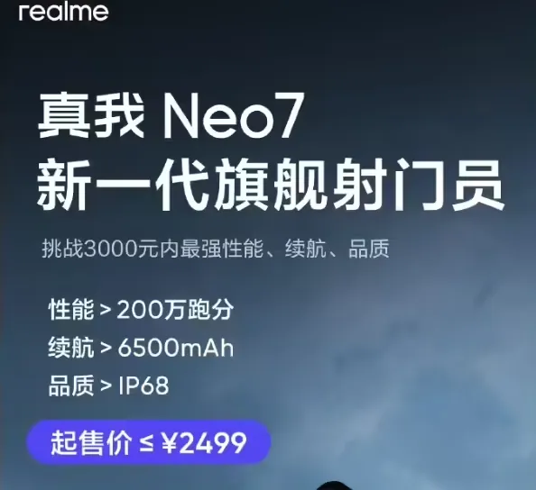 realme 本月官宣 Neo 系列,真我 Neo7 手机下月见,新系列号称 “坚持越级性能、领先游戏体验、科技潮水设计,打造更懂年轻人的电竞旗舰”。 真我官方本日发文预热 Neo7 手机,新机号称 “新一代旗舰射门员”。性能超 200 万分、续航>6500mAh、支持 IP68 级别防水、起售价 ≤ 2499 元。(来源:IT之家)