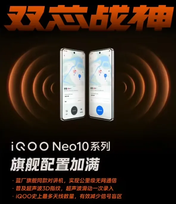 iQOO 再次发文预热旗下 Neo10 系列新机:新机全系标配蓝厂旗舰同款无网通讯、超声波 3D 指纹,拥有 iQOO 史上最多天线数目。 据官方先容,iQOO Neo10 系列手机将支持蓝厂旗舰同款对讲机功能,实现公里级无网通讯;遍及超声波 3D 指纹,支持滑动一次录入;iQOO 史上最多天线数目,镌汰信号盲区。(来源:IT之家)