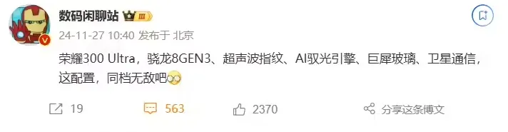 博主 @数码闲聊站 发文透露了光彩 300 Ultra 手机配置信息,新机搭载高通骁龙 8 Gen3 处置惩罚器,配备超声波指纹、内置 AI 驭光引擎、拥有巨犀玻璃,同时还支持卫星通讯。 现在光彩 300 Ultra 手机已上线官网开启预订,新机将提供墨岩黑和山茶白两种配色,以及最高 16GB+1TB 规格版本。新机外貌形象此前已被曝光,团体设计与 Pro 版相似,正面接纳曲面居中打孔屏;后置三摄,镜头 Deco 处印有赤色标识。(来源:IT之家)
