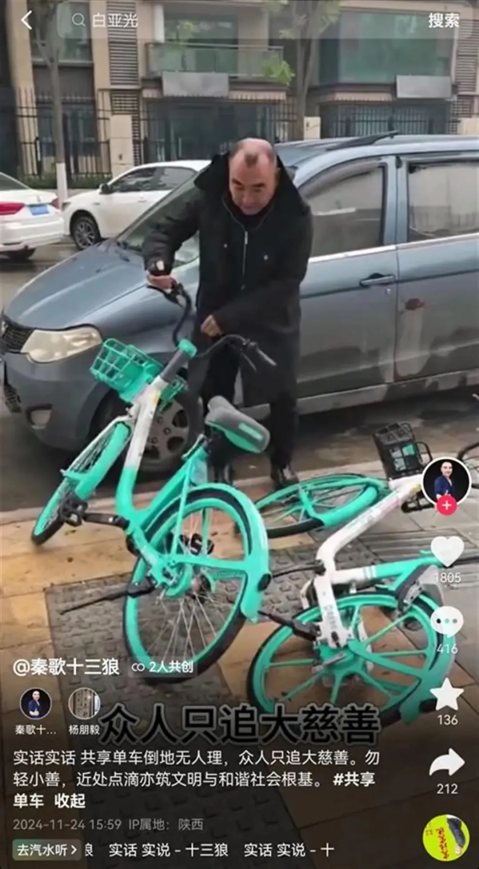 本日(28日),陕西广播电视台《吼秦腔》发布讣告,陕西著名音乐人,秦歌代表人物十三狼,因病医治无效,于2024年11月28日5:30去世,享年58岁。值得留意的是,其外交账号“秦歌十三狼”有17万多粉丝,几天前的11月24日还发表了扶起共享单车的视频,并配文说:实话实说,共享单车倒地无人理,众人只追大慈善。勿轻小善,近处点滴亦筑文明与调和社会根基。 |