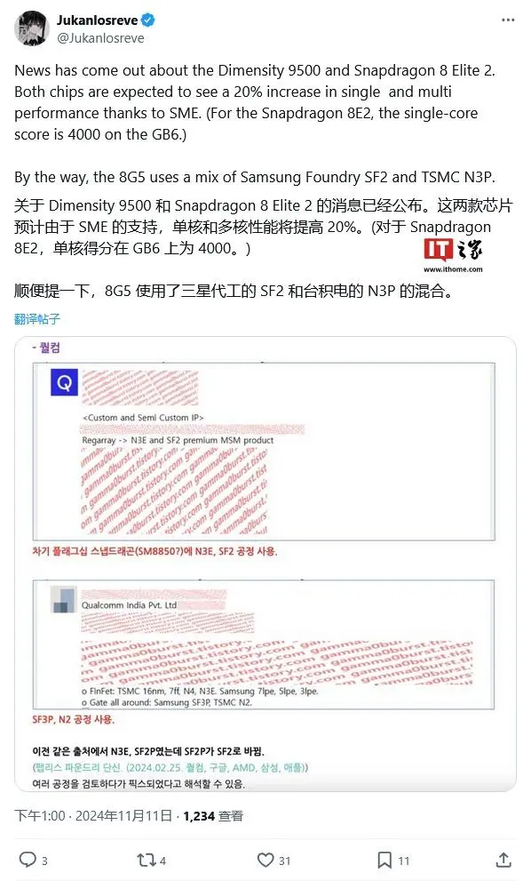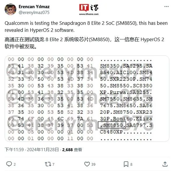 IT之家 11 月 30 日消息,消息源 Erencan Ylmaz 于 11 月 28 日在 X 平台发布推文,通过深挖澎湃 HyperOS 2 体系,在代码中发现了第二代高通骁龙 8 至尊版的踪迹。 根据相关代码表现,高通第二代骁龙 8 至尊版型号为“SM8850”,表明高通已提前启动下一代旗舰芯片的研发工作。 现阶段关于该芯片的信息并不多,毕竟第一波搭载高通骁龙 8 至尊版芯片的手机仍未完全上市,因此无法确认第二代高通骁龙 8 至尊版芯片的规格等。 此前消息称高通第二代骁龙 8 至尊版芯片将相沿第一代的 CPU 集群筹划,依然为 2P+6E 设置,不过主频会进步到 5.0 GHz。 高通骁龙第二代骁龙 8 至尊版芯片大概相沿 2+6 CPU 集群筹划,但 2 个性能焦点的时钟频率到达 5.0 GHz,而 6 个能效焦点的频率到达 4.0 GHz。 IT之家此前报道,高通第二代骁龙 8 至尊版芯片将采用台积电新的 3nm N3P 工艺,在三星的良率进步到可接受的水平环境下,大概还会肴杂使用 SF2 节点(也称为 2nm GAA)。 |
