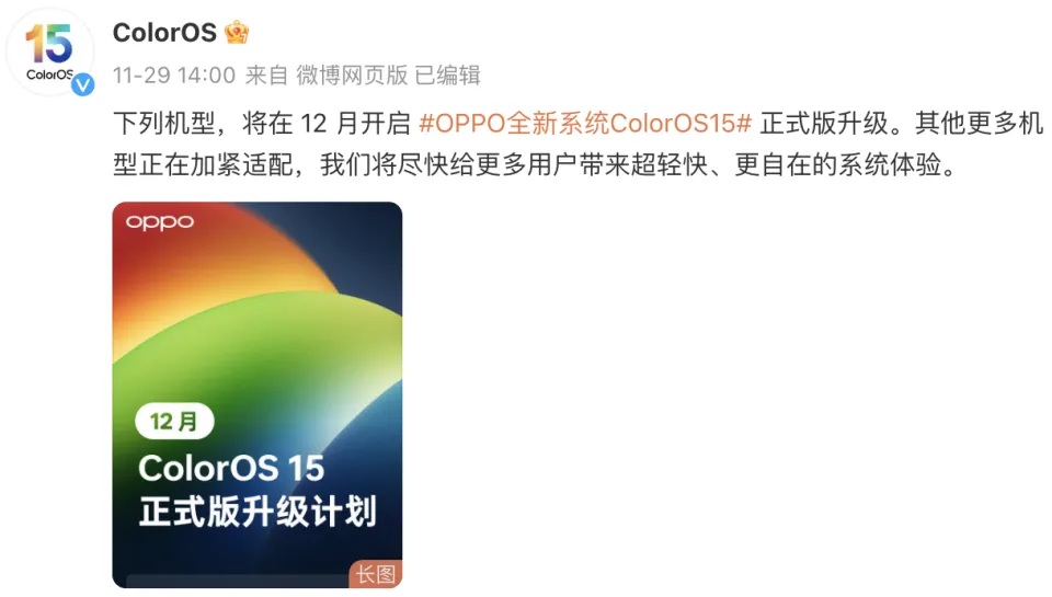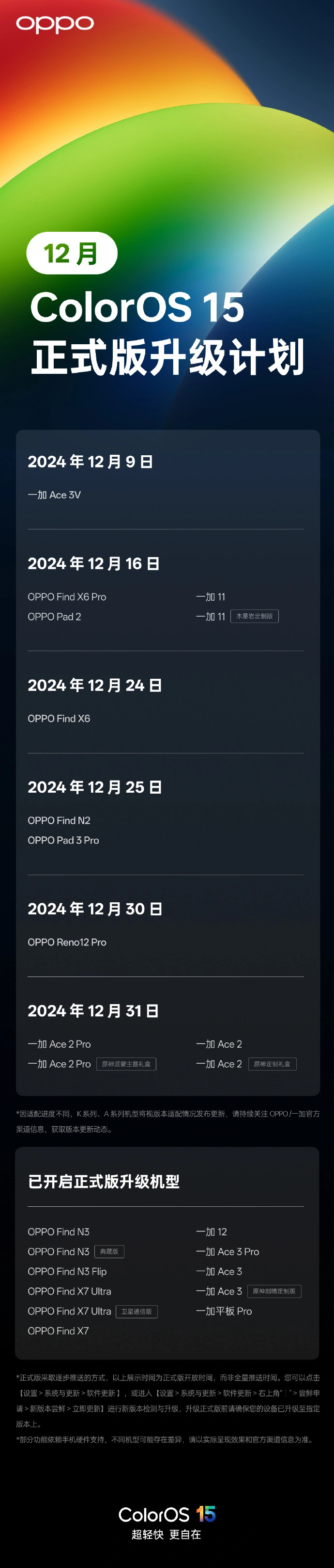 对于智能手机来说其性能不但仅要看硬件设置,还要看操纵体系软件,我们经常会跟各人分享智能手机操纵体系新版本升级更新信息,各人会在智能手机操纵体系新版本推送之后第一时间升级更新吗? 之前OPPO Find N3、OPPO Find N3典藏版、OPPO Find N3 Flip、一加Ace 3 Pro、一加Ace 3等机型已经开启了ColorOS 15正式版升级更新,很多OPPO,一加手机用户也是比力关注自己的手机什么时间可以升级更新到ColorOS 15正式版。 根据ColorOS官方分享体现,12月将有13款OPPO和一加机型开启OPPO ColorOS 15正式版升级。 12月ColorOS 15正式版升级更新支持机型,及升级更新推送筹划如下: 2024年12月9日,一加Ace 3V开始推送; 12月16日,OPPO Find X6 Pro、OPPO Pad 2、一加11、一加11木星岩定制版开始推送; 12月24日,OPPO Find X6开始推送; 12月25日,OPPO Find N2、OPPO Pad 3 Pro开始推送; 12月30日,OPPO Reno 12 Pro开始推送; 12月31日,一加Ace 2 Pro、一加Ace 2 Pro原神派蒙主题礼盒版、一加Ace 2、一加Ace 2原神定制礼盒版开始推送。 以上这13款OPPO,一加手机本月将连续开启ColorOS 15正式版升级更新,各人看看有没有你的手机。 |