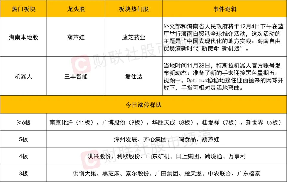 财联社12月2日讯,市场早盘震荡拉升,午后维持高位震荡,三大指数均涨超1%。沪深两市全天成交额1.79万亿,较上个生意业务日放量784亿。盘面上多个题材热门轮替活泼,全市场超4600只个股上涨,逾200股涨停或涨超10%,短线赢利效应“爆棚”。此中海南板块团体大涨,海南发展等20余股涨停。大消耗股体现活泼,电商、旅游、食品等方向领涨。呆板人概念股维持强势,三丰智能等20余股涨停。短线方面,感情再度活泼,昨日涨停股中逾八成个股飘红,昨日连板股晋级率超60%。下跌方面,部门芯片股午后调解,闻泰科技盘中直线跳水跌超7%。停止收盘,沪指涨1.13%,深成指涨1.36%,创业板指涨1.42%。 板块方面 板块上,海南概念股全线发作,神农种业、康芝药业、海南发展、欣龙控股、葫芦娃、华闻团体、海南瑞泽、海南海药、海南高速等20余股涨停。 消息面上,交际部和海南省人民政府将于12月4日下战书在蓝厅举行海南自贸港环球推介活动,这次活动的主题是“中国式当代化的地方实践:海南自由贸易港新时代 新使命 新机会”。此次推介活动将全面展示海南自贸港特色上风、早期劳绩、发展前景和为天下提供的互助机会,彰显中国对峙以开放促改革,创建更高程度开放型经济新体制的刚强决心。 而且本日午后部门深圳本地股有所异动,可见在海南概念股掀起涨停潮后,部门资金尝试按照“炒舆图”的风格举行延伸与扩散。不外须要注意的是,本日海南概念股的上涨本质是对后续出台的政策预期博弈,届时仍需防范利好落地后资金会集兑现的风险。 汽车整车概念股同样涨幅居前,赛力斯、力帆科技、海马汽车、广汽团体涨停,上汽团体、福田汽车、众泰汽车、安凯客车等个股涨幅居前。 消息面上,记者从上海市商务委获悉,今年以来停止11月28日,上海到场国家汽车报废更新申请量,以及上海市汽车以旧换新申请量合计高出10万份,动员新车贩卖高出200亿元。此外新能源汽车销量连续向好,比亚迪披露1—11月新能源汽车销量375.73万辆,同比增长40.02%。而赛力斯也披露前11月新能源汽车销量38.96万辆,同比增长255.26%。 呆板人概念股连续活泼,三丰智能、均普智能、五洲新春、捷昌驱动、爱仕达、奋达科技等个股涨停,江苏雷利、豪森智能、贝斯特、鸣志电器、北特科技涨超5%。 消息面上,特斯拉呆板人克日公布新盼望,搭载22个自由度机敏手,在屈曲/舒展的根本上,展示了外展/内收的全新姿态。此外11月29日,中国武器装备科技创新周央企中国兵装团体公布创建了人形呆板人创新连合体。但需注意的是,在早盘冲高后,呆板人概念股不少遭遇了炸板回落的情况,此中也包罗了北特科技、柯力传感等标识度较高的人气核心,故在连续两日大涨的短线趋于高潮的配景下,预计该题材后续分歧大概会进一步加剧。 个股方面 个股层面来看,短线赢利效应连续火爆,逾200股涨停或涨超10%,连板晋级率超6成。此中重组概念股南京化纤将市场高度开发至11连板,而IP概念股广博股份以9连板紧随其后,而像桂发祥、新天下等消耗股同样连续强势乐成晋级。葫芦娃叠加了本日最为火爆的海南概念股一字涨停。而三丰智能20CM2连板也乐成动员了呆板人方向连续走强。总体来看,目前市场的热门紧张还是围绕着IP经济、AI财产链、呆板人、大消耗、海南本地股这几大方向所展开。应对上仍可在后续盘面中探求相干题材的轮动性时机。 不外也要需注意的是,人气股日出东方本日冲高回落终极跌超9%,而上周五尝试向上反包的瑞斯康达,英联股份双双跌停。由于市场维持着较高的连板晋级率,资金对于反核标的的炒作热情相对较低,当个股断板后,每每便面临着走A的风险。 后市分析 本日市场连续普涨格局,三大指数均涨超1%,量能较之上周五再度小幅提拔,故目前价涨量增的良性布局下,后续指数或仍具进一步冲高之空间,后续仍先关注5日均线即可,在其被有效跌破之前,震荡向上的反弹布局仍有望连续。不外以目前不敷2万亿的量能程度来看,仍旧是无法支持其盘面的全部热门的,预计,特别在连续两日的普涨后,各热门间预计仍会展开新一轮的分化轮动,故应对上,此时再行追价的风险收益比力低,耐心等候分歧整理时的低吸时机或为更为稳妥。 国泰君安对于后市猜测也给出了最新观点,12月国内紧张集会会议召开在即,在内需有待提拔与外部受压的情况下,增量政策空间得以打开,以及更积极的促消耗办法。另一方面,11月中国制造业PMI实现“三连升”,也有利于风险偏好的维持与做多感情的连续。结合国内股市活动性也有支持,目前阶段仍可视为较佳的做多窗口期,后续可积极关注:并购重组、IP经济、固态电池、新型电力体系等方向。 随着普涨反弹的连续,短线感情指标全天位于活泼区之上。 市场要闻聚焦 1、国务院国资委、国家发展改革委连合出台政策 推动中心企业创业投资基金高质量发展 财联社12月2日讯,国务院国资委、国家发展改革委连合出台政策步伐,推动中心企业创业投资基金高质量发展,支持中心企业发起设立创业投资基金,重点投早、投小、投长期、投硬科技。着力加大创新资源投入,召募更多资金投向硬科技。支持中心企业围绕主责主业,聚焦庞大战略、重点范畴、紧张技能,发起设立概念验证基金、种子基金、天使基金等顺应科技结果转化及科技创新企业发展所需的创业投资基金;支持国有资源