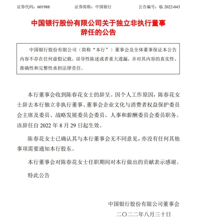 中新经纬8月31日电 在从北京大学辞职后,陈春花又辞任中国银行独立董事。 中国银行30日晚公告披露,该行董事会收到陈春花的辞呈。因个人工作缘故起因,陈春花辞去中国银行独立非实行董事、董事会企业文化与斲丧者权益掩护委员会主席及委员、战略发展委员会委员、人事和薪酬委员会委员职务。 泉源:中国银行公告截图 公告称,该辞任自2022年8月29日起见效。陈春花已确认其与中国银行董事会无差异意见,亦没有任何其他事项必要关照该行股东。 中新经纬查询中国银行2021年年报表现,陈春花自2020年7月起任中国银行独立董事,其2021年年薪为50万元人民币。 泉源:中国银行2021年年报截图 据媒体报道,陈春花现在仍继承华油能源非实行董事,根据公司2021年年报表现,其年薪为41.6万元。 百度百科先容表现,陈春花,1964年生,籍贯广东湛江。1986年获华南理工大学无线电系工学学士学位,2000年获新加坡国立大学企业管理研究生院工商管理硕士,2001年获爱尔兰欧洲大学工商管理博士,2005年南京大学商学院企业管理博士后。 此前,陈春花因华为“心声社区”的一则“华为与陈春花传授无任何关系”的声明陷入舆论旋涡,随后其又被曝出学历造假的标题。 陈春花就读的爱尔兰欧洲大学被扒出是一所“野鸡大学”——在教诲部涉外羁系信息网查询,经爱尔兰高等教诲当局主管部分承认的正规大学有25所,此中并没有该所学校。有说法称,陈春花传授用“博士”的身份吃了20年红利之后,被发现她并没有博士学历。 8月3日,陈春花在微信号“春暖花开”发布公开信体现,《与任正非:围炉日话》一文被盗版书商扭曲、窜改,其已委托状师告状相干平台上运营的盗版书商,2021年9月23号法院存案,现在案件还在推进中。同时,她也在公开信中承认博士学位未被认证。 当日,北京大学通过官方微博发声明体现,该校国家发展研究院收到了陈春花的辞职申请,学校按步伐克制其聘任条约。(中新经纬APP) |