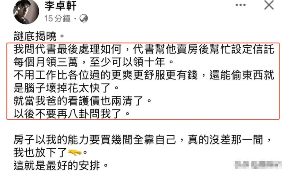 台湾“爷孙恋”女主林靖恩终于迎来了生存转机。 根据媒体最新消息,李坤城的儿子体现,父亲去世后留下的房产已经被变卖而且建立了信托基金,而作为李坤城的遗孀,林靖恩每个月能从信托基金里领取3万台币的生存费,折合人民币大概是6700元。 而林靖恩能从信托基金里领取生存费的时间至少是10年,也就是说一共能拿到360万台币左右,折合人民币也有80万了,这笔“意外收入”对28岁的林靖恩来说可以说是“济困解危”。 反之,李坤城的儿子并没有继承这一部分的遗产,但他的心态却很乐观,体现以他自己的本领都可以买得起几间房产,不差父亲这一间。别的,他还讥讽,现在林靖恩不用工作都能比在座各位过得更爽更舒服更有钱,如果她还去偷东西就是头脑坏了要么就是费钱太狠了。 众所周知,28岁的林靖恩由于和大40岁的台湾音乐人李坤城的一段“爷孙恋”一夜成名。据传,林靖恩和李坤城的相识照旧林靖恩父亲促成的,当年林靖恩的父母离异,父亲担心女儿不开心,请来李坤城引导女儿的音乐,没想到却“毁”了女儿的半生。 从2013年到2023年,林靖恩和李坤城在一起的时间才17岁而已,一个正值芳华的少女恋上其时已经年近60岁的中老年人。 也由于这件事,在和李坤城爱情的十年间,林靖恩也险些断绝了和家人的接洽。 林靖恩的父亲曾说过,林靖恩曾有一段时间和生母住在一起,而他和女儿已经很多年没有接洽了。 林靖恩奶奶也不喜欢林靖恩这个孙女,由于林靖恩常年不在家没有和她们接洽,林靖恩奶奶对这个孙女已经意气消沉了。 和李坤城在一起的10年里,固然和家人没接洽,不过有一定财力的李坤城在物质方面照旧把林靖恩照顾得不错,让林靖恩过上了多年富足的生存。 但就在客岁,李坤城去世之后,不到30岁的林靖恩的人生发生了巨大的厘革。先是由于和李坤城儿子争遗产闹得沸沸扬扬,末了据传是林靖恩继承了李坤城的房产,李坤城儿子则是继承了父亲的收藏品。 林靖恩拿到房产之后就敏捷变卖,得到了上百万的遗产,但是她却不懂控制,拿着这笔遗产开始浪费,住五星级酒店,还“大闹”酒店,在酒店里砸东西等等。 之后又被媒体发现林靖恩“流离街头”,和几个中老年男星在街头一起吸烟喝酒,还偷别人的外卖吃。 还由于去超市偷一瓶25元的饮料被发现后被罚款3000元台币。 李坤城去世之后,林靖恩的生存变得一塌糊涂,甚至有路人评价她看起来有点像是“精神失常”,也有人猜疑她是否由于李坤城的去世受到太大的打击。 回顾林靖恩的前半生,这10年期间她由于李坤城的原因过着无忧无虑的生存,现在一下子遭受巨变,难免精神上受到打击。 林靖恩的遭遇实在也令人感慨,从17岁到28岁,10年的芳华稍纵即逝,现在却让她的人生陷入逆境,才28岁的她将来又该何去何从呢。 |