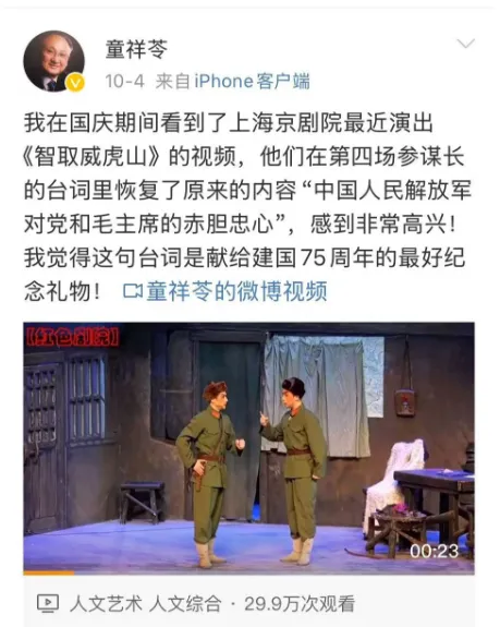 最著名的杨子荣走了。 解放日报·上观消息记者从上海京剧院获悉,12月2日下午,著名京剧演出艺术家童祥苓因病在瑞金医院去世,享年89岁。 童祥苓1935年生于天津 ,发展在北京,8岁启蒙学戏,专工老生武生,师从富连成科班的名师雷喜成、刘盛通、钱富川,后又拜马连良、周信芳为师,终极形成余、马、麒各派兼备的风格,独树一帜。 新中国创建后,“童家班”参加上海京剧院,成为中国舞台上著名的京剧名角之家。 本年国庆期间,童祥苓还在微博发文: 王珮瑜和张涵予 网友:老师千古 来源:潮消息综合自上观消息、文报告、网友批评 |