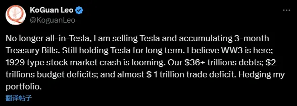 上周末,有网友在交际媒体X(前身为“推特”)上问是否还持有特斯拉,廖凯原复兴道,他会长期持有,但不再all-in特斯拉,“我正在出售特斯拉股票,并增持美国3个月限期的国库券。” 廖凯原称,此举是为了对冲他的投资组合。值得一提的是,“股神”巴菲特也大幅增持了美国短期国库券。二季度末的时间,伯克希尔哈撒韦持有的短期美国国库券规模乃至超过了美联储。 “我信赖第三次天下大战(WW3)已经到来,1929年那样的股市崩盘即将到临。”廖凯原称,“我们的债务超过36万亿美元;预算赤字达2万亿美元;商业赤字接近1万亿美元。” 1929年10月,纽约股市忽然崩盘,这场股灾还让美国和环球进入了长达10年的经济大冷落时期。与之相呼应的是,“股神”过去也说过会在经济危急期间购入短期国库券。 必要指出的是,在廖凯原表述中,他以为第三次天下大战已经到来,而不是即将发生。这种说法表明,他以为当前的某些情况,比方地缘政治辩论或告急局面,已经构成了雷同于天下大战的局面。 廖凯原没有在交际媒体上透露他抛售特斯拉的规模和速度。如果这是真的,那么对于这位以“特斯拉巨鲸”形象闻名的人来说,将是一个非常大的变化。 有数据体现,停止今年5月,廖凯原持有2770万股特斯拉。从前时间,廖凯原曾告诉媒体,他信赖特斯拉CEO埃隆·马斯克,并有志于不停增持这家电动汽车制造商的股份,直到他的身家到达1000亿美元。 但自从马斯克收购推特后,廖凯原对其的品评越来越多,称这个交际媒体平台分散了马斯克的时间和注意力。年初,廖凯原炮轰马斯克,品评他通过大量出售个人股票陵犯了股东和公司的长处。 廖凯原还表现,他会用自己2700万股持股,投票反对马斯克550亿美元的薪酬筹划。本周一,美国特拉华州地方法院法官再次驳回了马斯克在特斯拉的高额薪酬包。 |