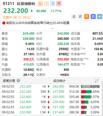 华盛资讯8月31日消息,早盘比亚迪H股低开近8%,克制发稿,跌幅扩大至11.71%,报价232.2港元,当前成交额超21亿港元,市值蒸发超800亿港元。 港交所公告,巴菲特与8月24日出售133万股比亚迪H股,套现约3.69亿港元。 巴菲特减持比亚迪133万股,比亚迪:不消过分解读,公司策划齐备正常 港交所昨日公告,伯克希尔哈撒韦公司在8月24日出售了133万股比亚迪H股,均匀代价277.1港元/股,在比亚迪的持股比例降至19.92%。按此盘算的话,伯克希尔哈撒韦公司套现了约3.69亿港元。 对此,比亚迪投资者关系部分表现,事先也不知道。对于市场州?推测,市场关联很多说法,具体真真相况(缘故原由)并不知道,不消过分解读。近期比亚迪未有庞大事项未披露,公司策划齐备正常。 怎样直接对港股标的举行沽空(融券利用)? 当你以为某只票将会下跌,可以将账户的现金大概证券作为抵押并付出肯定的融券利钱,借入股票后卖出,当后市股价下跌后再从市场低价购买类似数量的股票举行归还,赚取股价下跌的价差收益。 那么题目来了!投资者怎样举行沽空买卖业务?有哪些股票是支持沽空的?港股沽空的融券利率、交收规则以及沽空的收费标准?申请开通港股沽空服务必要具备什么条件? |