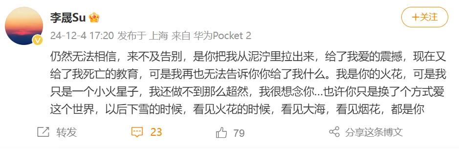 据多家台湾媒体报道,着名作家琼瑶12月4日下战书1时22分许,在新北市淡水区家中离世,享寿86岁。 在电视剧《新还珠格格》中饰演“小燕子”的李晟发文哀悼:“仍旧无法相信,来不及告别,是你把我从泥泞里拉出来,给了我爱的震撼,如今又给了我殒命的教诲,可是我再也无法告诉你你给了我什么。我是你的火花,可是我只是一个小火星子,我还做不到那么超然,我很缅怀你…大概你只是换了个方式爱这个天下,以后下雪的时间,瞥见火花的时间,瞥见大海,瞥见烟花,都是你。” 潇湘晨报综合 报料、维权通道:应用市场下载“晨视频”客户端,搜刮“帮助”一键直达;或微信添加报料客服:xxcbcsp;或拨打热线0731-85571188。如需内容互助,请拨打政企服务专席19176699651。 |