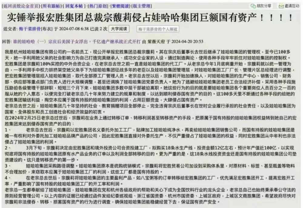 现在,他们已将娃哈哈团体和宗馥莉告上了法庭。据有关消息,此案已被法院受理,但还未正式备案。 宗馥莉改革后,员工收入或减半 起首是改签劳动合同后,相干员工的工资大概淘汰以致砍半。 有娃哈哈的员工爆料称,若签约宏胜饮料团体,劳动报酬按年薪制算,广泛收入低于娃哈哈团体。“划一职级的员工,收入能低一半”。 其次,员工之前地点的娃哈哈团体,实行的是“干股分红”制度。若签约宏胜,则意味着放弃分红。 而所谓“干股分红”,是从之前娃哈哈全员持股演变而来的鼓励机制。 1999年,娃哈哈团体举行了一轮股改,员工以每股1元代价认购股份,随岗位上升可加大认购更多股份。 但在2018年,宗庆后领导的娃哈哈团体,对员工持股制度做出了庞大调整,由职工持股会将员工持有的股份全部回购,转而实行“干股”制。 回购方案条件是“2元特别分红加1元股本”,即以每股3元代价回购员工持股。 至此,员工开始只享有分红,但不再持有股份。 而恒久以来,股权分红是娃哈哈团体员工收入的紧张泉源。据娃哈哈中高层的员工表示,此前的干股分红能占职工一年收入的50%以上。 正因云云,“干股分红”的取消,才让这群娃哈哈员工云云愤怒。 除此之外,另有员工对2018年的回购过程提出质疑,称娃哈哈在疑似与部门员工没有充实沟通的环境下,便实行回购,并对职工持股会的回购资金泉源抱有疑问。 这里给各人阐明一下,娃哈哈的职工持股会,持有娃哈哈24.6%的股权,代表职工利用股东权利,从公司得到相应利润后,根据员工持股环境再举行分红发放。 假设娃哈哈的回购资金,用的直接是职工持股会里掏出来的钱,那不就是用本应属于员工的分红,买回员工手中的股权。 同时,这些持股员工对回购代价的公道性也提出质疑,以为当时回购对价偏低,侵害了他们应有的长处。 总的来说,就是宗馥莉上任后,让员工兜里应有的钱变少了,大伙不平气,就把她给告了。 两个“娃哈哈”? 现在,除了员工合同,娃哈哈的生产线和经销商合同,都在向宏胜饮料团体转移。 企查查体现,宏胜饮料团体与国有控股的娃哈哈团体并无股权关系。 宏胜饮料团体的大股东是恒枫商业有限公司,持股98%。这是一家在英属维尔群岛注册的公司,背后实控人不详,有报道称实由宗馥莉控制。 别的持股2%的浙江恒枫投资有限公司,实控人为宗馥莉。 这个宏胜饮料团体,是娃哈哈紧张的代工厂,规模庞大。2022年,其年营收已突破百亿元。 不外,一位自称杭州娃哈哈团体前员工的人,对宏胜饮料团体的评价却不太好: “宗馥莉以宏胜团体名义委托外加工工厂,贴牌加工娃哈哈纯净水,再卖给娃哈哈团体贩卖公司,而国有持股的娃哈哈团体,是唯一有权利对外委托加工娃哈哈品牌产物的公司。 因此,宏胜团体直接对外委托生产,不但严峻陵犯了娃哈哈团体的权益,同时,宏胜团体从中牟利,也非法陵犯了娃哈哈团体的利润。” 结 语 “娃哈哈本年干股分红不会取消、薪资布局没有变化。分红将基于个人的岗位绩效,而非仅凭过往的资历或级别来分配。” 但这也没有完全取消一些老员工的顾虑:本年不取消了,那来岁呢? 想必,这也是越来越多娃哈哈员工参加维权队伍的缘故原由之一 各人觉得娃哈哈员工的诉求公道吗? (文首图泉源于视频截图) |