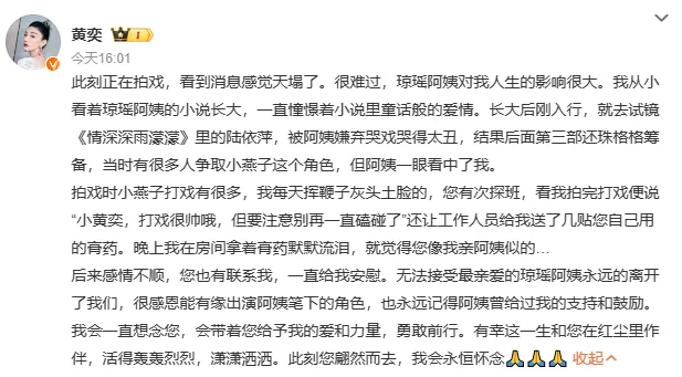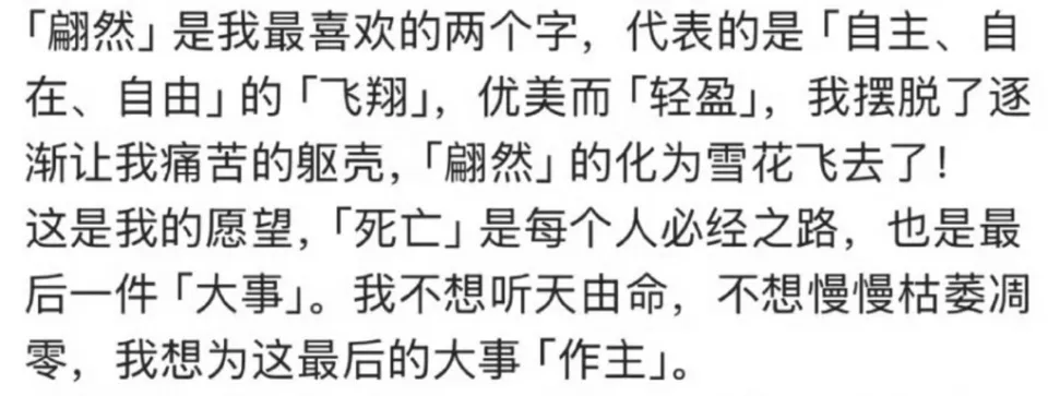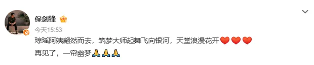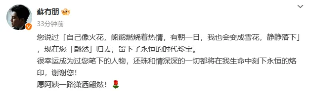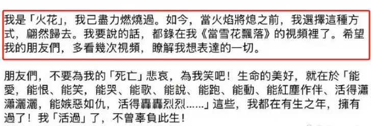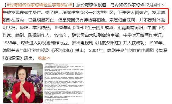 文案|一纸枕书 编辑|酒酱紫 没想到在12月初,一个噩耗让热搜又爆了。 据台媒报道,着名作家、编剧琼瑶在家中自尽去世,享年86岁。 与此同时,她的交际平台更新了一封遗书,文章写道: “我不想听其自然,不想逐步枯萎凋零,我想为这末了的大事「作主」。” “我是「火花」,我己尽力燃烧过。现在,当火焰将熄之前,我选择这种方式,翩然归去。” 相信许多网友都跟我有着同样的感受,惊闻噩耗,万分悲伤。 齐备都来的太突然了,似乎一家人围坐在电视机前追《还珠格格》、《情深深雨濛濛》的日子就在昨天。 以是这毕竟是怎么一回事儿? 01 翩然归去,大张旗鼓从遗书中我们可以发现,琼瑶是本身选择死亡的,她不愿像其他老人那样履历病痛、卧床,感受着生命渐渐凋零的苦痛。 而在字里行间中,我们也看不到她对于死亡的畏惧、恐惊,更多的还是她面临生命的洒脱与通透。 固然,对于琼瑶的死因,网友们还是存在质疑,到底是自尽,还是有外界因素存在? 当地警方在接获转达厥后到现场,开端清除外力到场,而对于死亡细节,眷属们不愿意过多透露。 听说早在7年前琼瑶就嘱咐子女们:如病重不要救我,让我没有痛苦地死去! 这次也是子女们回到琼瑶住在的淡水社区中,发现她躺卧在屋内,已经显着死亡。 以担当的消息。详细缘故原由还在观察当中,无论有什么黑幕,这个消息对于网友以及跟琼瑶互助过的人来说,无疑是一个难以担当的消息。 有一家媒体接洽到林心如本人,她一度哽咽道无法语言,经纪人也透露:“发生得太突然了,还在整理感情,无法回应。” 随后许多明星也纷纷在交际媒体上表达哀悼。 “五阿哥”、“杜飞”苏有朋说:“很荣幸成为过您笔下的人物,还珠和情深深的齐备都将在我生掷中刻下永恒的烙印,谢谢您,愿阿姨一起洒脱翩然!” “尔泰”陈志朋哀悼:“愿您如雪花般翩然飞舞,自由安闲。”、“雪姨”王琳表现:“依然在人间的我们将永久记着,我们的您。” 还有两位“小燕子”、“楚濂”保剑锋、“香妃”麦迪娜等演员都表达了本身对于琼瑶的吊唁。 直到这一刻,我们才意识到一个期间真的逝去了。 正如网友所说:“琼瑶的离世,仿佛为谁人曾经‘为爱痴狂’的期间,画上了一个句号。” 但她的死,没有悲苦,没有遗憾,没有不甘,只有我们认识的浪漫。 原来琼瑶笔下的任何一个故事,都比不上她人生的大张旗鼓。 02 为爱燃烧,光辉璀璨我想只有真正爱过的人,才气写出那一部部感人至深的爱情桥段。 而琼瑶的一生真的犹如火花般,为爱燃烧,无怨无悔。 她的人生中一共有三段感情最为铭肌镂骨。 第一段是跟大本身20岁的语文老师蒋仁。 固然当时的她心智还不算成熟,但感情却是诚挚的、纯粹的。 只惋惜这段感情注定不被世俗所包容,分开后的蒋仁也终生未娶,而在他死后。琼瑶也抱着遗像哭成了泪人。 人总是为幼年而不可得的爱情,念念不忘。 白月光的杀伤力,懂的都懂。 第二段是跟本身的原配丈夫庆筠。 大概也是由于初恋无疾而终,这一次琼瑶掉臂父母再次反对,毅然决然与无名作家庆筠走到了一起,两人还剩生一子,这也是琼瑶唯一的孩子。 但婚后的生存没有书本中那么浪漫,随着琼瑶渐渐展露才华,庆筠自卑、无能等貌寝的嘴脸袒暴露来,又染上了赌瘾,一度导致她和儿子生存艰巨困苦。 只能说,她没有在对的时间遇到一个对的人。 第三段是跟杂志主编平鑫涛。 这段感情也是颇受争议,只因平鑫涛跟琼瑶确认爱情关系的时候,还有一位原配妻子林婉珍。 三人的关系剪不断,理还乱,然而不可否认的是,受害者只有被迫仳离的林婉珍。 但琼瑶与平鑫涛确实属于魂魄朋侪,两人完婚后奇迹也如日方升,还创建了影视公司。 这才有了反面《几度夕阳红》、《还珠格格》、《情深深雨濛濛》等家喻户晓的经典剧作。 在2019年平鑫涛病逝,我想这对于琼瑶来说也是一个巨大的打击。 假如丈夫还陪在本身的身边,想必她也不会选择用自尽的方式竣事本身的生命。 尽管观众们对于琼瑶的离世倍感遗憾,但对于她本身来说,能够活得洒脱热烈,就已经不负人生了。 正如她本身所说:“我的一生大概就是这个‘爱’字害了我,也是‘爱’字成绩了我。” 黑白对错,后人着实很难评说。 然而我们可以确定,琼瑶是苏醒的留恋。 哪怕爱情是毒药,她也用试一试的态度沉溺在浪漫之中,这何尝不是一种勇气? 连爱都不怕的人,又何惧生死呢? 03 结语颠末了山路的坎坷不平, 回首琼瑶的人生,履历过坎坷风浪,飞短流长,但终究为观众们留下了一部部经典的作品,这是她为爱燃烧的热火,值得全部人去铭记。 我想许多明星也应该去感谢琼瑶的作品,由于没有她,就没有他们的光辉。 只不外有些人忙着伤心,有些人忙着遗憾,还有人在哀悼琼瑶的词条中试图蹭一蹭热度,比如这位声称本身是“琼瑶末了一位女主”的胡连馨,营销话术都预备好了,生吃人血馒头,真的不会心痛吗? 从艺先从德,演员最紧张的就是要有感恩之心,不能一点底线都没有,否则自然会遭到反噬。 奉劝这些年轻小花们都学会审时度势,什么该做什么不该做要内心有数。 末了让我们跟琼瑶阿姨说一声,一起走好。 ——END—— |