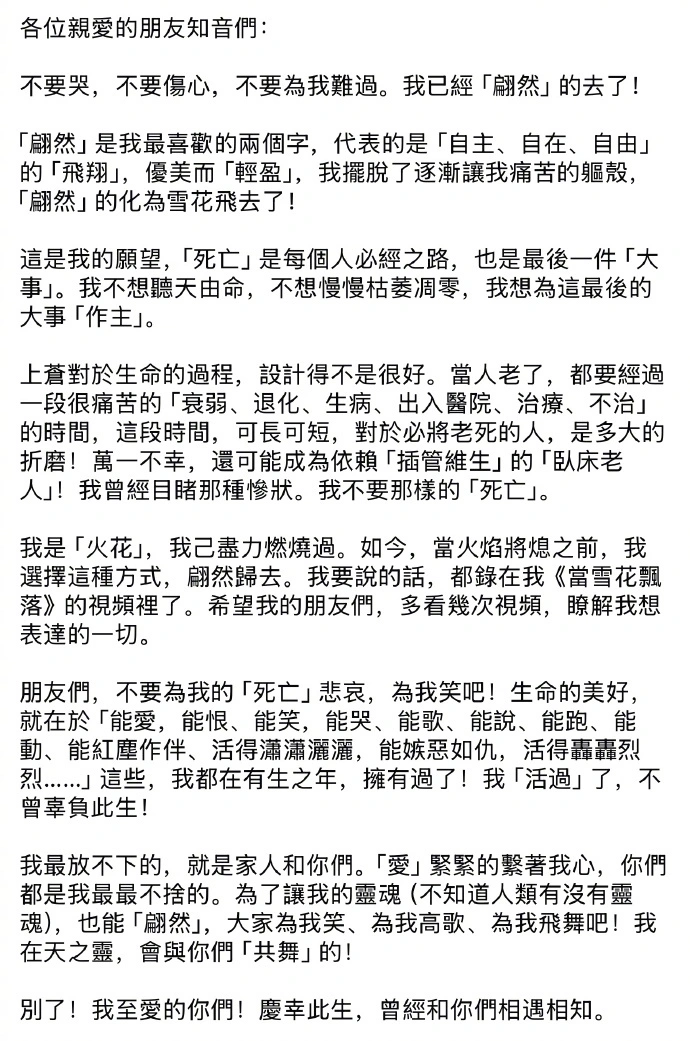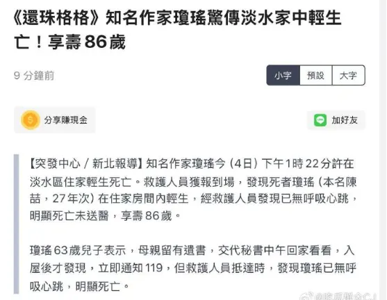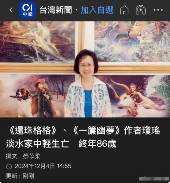 台媒报道,言情教母在淡水自己的别墅轻生,享年86岁。 有网友早在网上曝出琼瑶遗书,在遗书中,琼瑶潇洒的表现,渐渐摆脱了让她痛楚的躯体。 她称不想逐步枯萎,不想成为卧床老人,盼望能活得有尊严有质量。 她表现,自己度过了潇洒的人生,轰轰烈烈活过,此生无憾。 琼瑶老年后受坐骨神经痛困扰,时不时发病,不绝靠针灸等缓解病情。 2022年由于要掩护视力,她淘汰了上网,被传失智,她还专门写文澄清,今后又出现在大众视野。 2023年,她曾发文,表现又伤到了腰,举措未便。 琼瑶的身材大要状态很好,但看得出腰伤不绝困扰着她,她在遗书中也提及了对于举措未便的担心,不知道这是不是促使她末了下决心的重要来由。 她对殒命的看法不绝很坚持,2017年,她丈夫平鑫涛失智、中风,在经过一段时间治疗后,医生提出插尿管和胃管治疗,被琼瑶拒绝了。 为此,平鑫涛的子女坚持为父亲治疗,琼瑶坚持拒绝,他们大吵频频,反目成仇,琼瑶表现,既然丈夫的身材已经不可逆转,那就应该生存末了的体面。 丈夫去世后,琼瑶不绝住在他们的庄园“可园”里,2022年,她身材还好,规划了“可园”重新装修,筹划在内里构筑咖啡馆等设施,供粉丝回想芳华时光,短短几年物是人非。 琼瑶原名陈喆,1949年随父母赴台,一生笔耕不辍,著有多部脱销小说,旗下还有三家影视公司。 16岁发表小说《云影》,25岁出版《窗外》。代表作有《窗外》《还珠格格》《烟雨濛濛》,她的小说绝大部门都被改编成影视剧,有些以致反复翻拍。 2003年的三联就报道琼瑶靠着小说和影视剧的财产链已经赚取了上亿美元。 她居住的庄园代价就高出5亿,不绝都有不少人去观光。 此次,琼瑶的遗书中并没有提及遗产分配,她2017年与平鑫涛的子女闹翻后似乎就再也没有来往。 除了创造了惊人的财产,琼瑶的影视剧也捧红了一大批演员,不少演员都是由于她的剧走红的。 归亚蕾 归亚蕾1964年当选中国小姐冠军 ,1966年出演《烟雨濛濛》中的依萍,得到金M影后年仅22岁,成为其时最年轻的影后。 归亚蕾气质优雅,之后又出演了《大明宫词》等精良作品。 她固然身在娱乐圈,做人却不浮躁,她嫁给初恋,生育了两个女儿,至今情人恩爱如初。 刘雪华刘德凯 刘雪华1959年出生,1986年出演了琼瑶的电视剧《几度夕阳红》一炮而红,2年后凭借电视《庭院深深》得到金钟最佳女主角。 刘雪华长相大气,一双眼睛剪水秋瞳,堕泪时更是楚楚可怜,被称为“眼泪女皇”。 作为琼瑶的爱将,她出演了多部琼瑶作品。 除了以上提及的还有《在水一方》《烟锁重楼》《雪珂》《哑妻》《一帘幽梦》《三朵花》《海鸥飞处彩云飞》《望夫崖》等,在年代戏方面,她是堪称琼女郎之最。 刘雪华年轻时与刘德凯相恋,但对方花心还渣,不绝随处包涵,刘雪华为了他流了一个孩子,造成终身不育,但刘德凯终极另觅新欢。 刘雪华后来嫁给比自己大13岁的邓育昆,两人1999年完婚,但2011年邓育昆在调试电视天线时不慎坠楼。 刘雪华现在独自生活。 刘德凯是最著名的琼男郎之一,他形状英俊气质潇洒出演过《一帘幽梦》费云帆,《新月格格》努达海。 他曾与配音员王景平闪婚,育有三个子女,期间与演员徐贵樱也有感情胶葛。 在拍摄《风里的爱》时他对刘雪华一见钟情,开始寻求,但此时他与王景平并未仳离,刘雪华并不知情,得知原形后她已经情根深种,难以自拔,只有苦苦坚持。 而后,刘雪华有身,刘德凯答应会完婚。 但此刻他名声已起,在法国拍摄《一帘幽梦》时他又与一年轻女子安琪相识并闪婚,此刻刘雪华有身3个月。 得知消息后的刘雪华容貌形状模糊,不慎跌倒流产,并被迫摘除了子宫。 由于过于渣,刘德凯口碑下滑,奇迹停滞,安琪也在生下儿子后就回到了法国,离开了他。 但奇迹不顺并不影响他的魅力,据悉他现在与小16岁的女友在一起,相亲相爱。 林青霞秦汉秦祥林 琼女郎和穷男郎总是成对出现,尤其是早期,不知是不是入戏太深,他们的感情经历与剧中的狗血相比毫不逊色。 号称50年才出一位的尤物林青霞在秦汉和秦祥林之间周旋了快10年,却仍旧不得挚爱。 1973年,19岁的林青霞在拍摄《窗外》时认识了翩翩公子秦汉,秦汉其时的妻子是邵乔茵,两人已有2个孩子。 但秦汉对林青霞却爱慕不已,未经世事的少女陷落了。 秦汉一面临林青霞献殷勤,一面回家告诉妻子,自己两个都爱,导致妻子离家出走,舆论的压力给到了林青霞。 林青霞心生躲避之意,几经辗转,去了美国。 此刻,同为琼男郎的秦祥林便借机对林青霞睁开了寻求,为此他与爱人萧芳芳分手。 林青霞人在美国,但仍旧盼望秦汉,只是秦汉始终夷由,不肯答应,林青霞一气之下与秦祥林文定。 结果,2年后,秦汉去探班林青霞,林青霞立刻毁了婚约,又跟了秦汉。 秦汉仳离后,林青霞高调公布与他爱情,并表明了乐意完婚。 结果秦汉却犹夷由豫,终极,林青霞看出秦汉不会与她完婚,扫兴离开,生活工作都陷入低谷。 幸亏一年后,她就接到了《笑傲江湖》,奇迹回春,随后嫁给富豪邢李。 秦汉现在只身与孩子共享天伦,秦祥林娶了素人。 当年在荧幕上神仙般的人物也都老了。 马景涛岳翎金铭 马景涛又称“咆哮帝”,他的演技和形状现实被低估了。 他以《青青河滨草》成名,之后连续出演了《梅花烙》等作品。 他拍戏以情绪激动,嗓门大,心情夸张著称。 由于心情过于夸张,他动情的演出也被制成了很多心情包