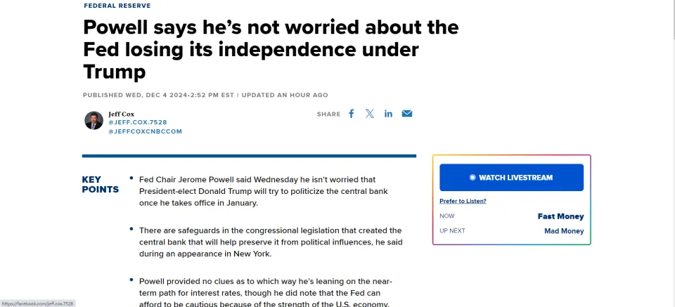 每经编辑:毕陆名 美东时间12月4日周三,美股三大指数团体收高,道指涨0.69%,初次收在45000点之上,纳指涨1.30%,标普500指数涨0.61%,三大股指均创下收盘汗青新高。 美股“七姐妹”中,英伟达收涨将近3.5%,亚马逊涨超2.2%。迈威尔科技收涨超23%,创2023年5月份以来最佳单日体现。 比特币连续拉升,突破99000美元/枚,日内涨2.24%。 商品市场方面,WTI 1月原油期货收跌1.40美元,跌幅2%报68.54美元/桶。布伦特2月原油期货收跌1.31美元,跌幅1.78%报72.31美元/桶。 消息面上,美联储主席鲍威尔重申,联储在经济向好形势下有本领更审慎地对待降息,如今判定特朗普任总统对利率的影响为时尚早,而且排除了特朗普上台后出现所谓“影子美联储主席”的可能性。 加密钱币概念股大涨美股三大指数团体收高,停止收盘,道指涨0.69%,纳指涨1.3%,标普500指数涨0.6%,三大股指均创下收盘汗青新高。 美股“七姐妹”中,英伟达收涨将近3.5%,亚马逊涨超2.2%,苹果涨0.15%,Meta Platforms涨0.02%。 加密钱币概念股走强,Bit Digital涨逾13%,MicroStrategy涨近9%,嘉楠科技涨近8%,Riot Platforms、Coinbase涨近7%。 迈威尔科技涨超23%,公司第三财季红利超预期,并发布了强劲的第四财季业绩指引。赛富时涨逾11%,第三财季业绩超预期,并上调整年营收指引。 纳斯达克中国金龙指数收跌1.38%,热门中概股多数下跌,高途跌超10%,京东、好未来跌超3%,百度、爱奇艺、理想汽车跌超1%。涨幅方面,网易涨1.6%,小鹏汽车涨0.79%。 ETF中,富时中国3倍做多ETF收跌2.19%,中概互联网指数ETF收跌1.54%,中国科技指数ETF收跌1.18%。 美联储主席鲍威尔发声据外媒报道,美东时间12月4日周三,在纽约时报主理的DealBook/Summit会议上,鲍威尔表现,美国经济的强劲意味着,美联储可以在降息方面体现出肯定的克制。他说:“美国经济状况非常好,没有来由不继承保持这种势头。好消息是,我们可以(在降息方面)更审慎一点。” 这是鲍威尔在本月、即12月美联储钱币政策会议的玖犀期到来前末了一次公开发言。投资者关注本次发言的一个重要缘故因由就是盼望,找寻本月美联储会不会继承降息的蛛丝马迹。不外,本次鲍威尔并未直接评论美联储12月17日至18日的会议是否会决定降息。 鲍威尔以为,劳动力市场的下行的风险减少。在经济强劲增长、物价上涨的通胀略为有黏性时,美联储可能会更加审慎。随着时间的推移,美联储的政策利率会更加中性。美联储可以保持耐心,可以审慎地迈向中性利率。 谈特朗普政府 与过往一样,鲍威尔继承机器地夸大,美联储的独立性受到美国法律保护。 但特朗普也讨论过“影子美联储”的假想——通过提前任命一个影子美联储主席,对外释放“前瞻指引”,使得真正的鲍威尔发言变得不紧张。 对此,鲍威尔给了一个意味深长的眼神。 他也表现,这种环境不太可能发生,美联储与各个政府部分之间的关系有一套固定的情势,特殊是与财务部。在过去75年里,美联储主席与财务部长每周都要晤面吃一次饭,偶尔是早餐,偶尔是午餐。更关键的是,机构之间也会各自尊重边界和权力的边界。 鲍威尔也解释了为何如今不能在政策考量中纳入“特朗普关税”:“我们不知道会加多少税,不知道详细的时间、会影响哪些商品,不知道哪些国家的商品会被征税,也不知道关税会以怎样的环境传导进入代价,也不知道其他国家会怎么抨击,所以不可能基于这么多不知道来订定政策。” 鲍威尔表现,美联储会建模、评估、观察关税题目,但钱币政策是关于眼下正在发生的事变。 美国经济比9月预期更好 在有关美国经济的表态中,鲍威尔表现经济状况“非常好”,通货膨胀下降的同时,赋闲率相对较低。他增补说,经济比九月份预期的要强劲,美联储在低沉利率时有余裕可以更加审慎。 他也回应称,九月份的超规格降息旨在转达一种信号:如果劳动力市场继承疲软,美联储随时准备支持劳动力市场。 对于拜登政府的非农数据总是调解的疑问,鲍威尔表现这是就业市场上行的范例体现,同时非农观察数据也是最好的劳动力数据之一。最终就业数据会通过报税数据举行调解,但基于观察的非农报告依然是最早能拿到的数据。 谈比特币 关于加密钱币,以及潜伏的美国比特币国家储备,鲍威尔夸大,比特币的竞争对手是黄金,不是美元。 鲍威尔表现,比特币就像黄金一样,只不外是假造的。人们并没有将比特币作为付出或储存价值的工具,它的颠簸性太大了。所以比特币不是美元的竞争者,而是在跟黄金竞争。 就在鲍威尔说这句话前不久,美国当选总统特朗普公布提名加密钱币支持者保罗·阿特金斯继承美国证券交易业务委员会主席。这一任命也使得比特币代价短线拉涨,从约9.5万美元狂奔至9.9万美元。 除了支持加密钱币外,阿特金斯也曾品评次贷危急后的银行业羁系政策,比方多德-弗兰克法案对银行业的负担过重。 每日经济消息综合公开消息 免责声明:本文内容与数据仅供参考,不构成投资发起,使用前请核实。据此操纵,风险自担。 每日经济消息 |