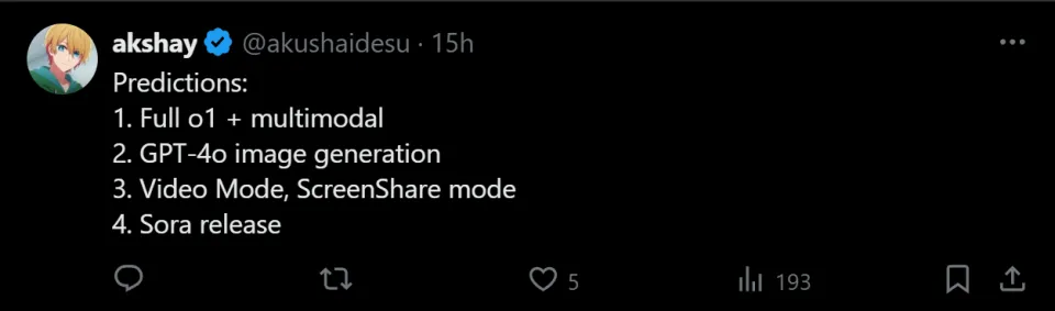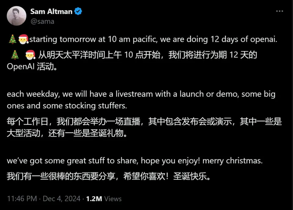 每经记者:蔡鼎每经训练记者:宋欣悦每经编辑:兰素英 本地时间12月4日,OpenAI突然在外交平台上放出“王炸”,公布从12月5日开始,OpenAI的圣诞季特殊活动即将拉开帷幕,活动连续12天,期间会放出“一大堆新事物”。 OpenAI首席实验官山姆·奥尔特曼(Sam Altman)补充说,每个工作日,OpenAI都会有一场直播,展示最新技能或进行产物演示,此中一部分是重磅发布,还有一些是“圣诞小惊喜”。 已经1个多月没有任何动作的OpenAI,这次12天的技能分享活动是史无前例的,在整个科技界都非常稀有。 知恋人士透露,活动期间,OpenAI将发布文生视频模子Sora和一款新的推理模子。 奥尔特曼在周三《纽约时报》的Dealbook大会表现,AGI到来的时间会比天下上大多数人想象的要早,可以大概完成复杂任务的AI智能体将在来岁成为现实。 图片来源:X平台 Sora、满血o1要来了?OpenAI的消息一出,网友们炸开了锅,纷纷开始猜测OpenAI的“圣诞大礼包”里到底装了些什么。 “Sora”“让免费用户用上o1-preview”“发布GPT-4o图像功能”“增强ChatGPT的高级语音模子”…… 网友们的猜测各不雷同,但存在一个共识,那就是活动期间,OpenAI将正式推出Sora和满血o1。 图片来源:X平台 据外媒报道,知恋人士透露,OpenAI将在此次活动中,发布文生视频模子Sora和一款新的推理模子。 别的,OpenAI Sora项目标研究主管比尔·皮布尔斯(Bill Peebles)在X平台上,转发了OpenAI工作职员发布的一则帖子,该帖子称“难以置信,OpenAI返来了”,比尔复兴道:“没错。” OpenAI高级研究副总裁马克·陈(Mark Chen)也复兴道,“懂的都懂(IYKYK)。” 图片来源:X平台 此前,前OpenAI首席技能官米拉·穆拉蒂(Mira Murati)曾在3月份告诉《华尔街日报》,Sora将于本年年底上市。 而就在上周,Sora的内测版本还疑似遭到了恶意泄漏,有人在大模子平台HuggingFace上泄漏了Sora的API,使其短暂开放了1小时左右。 与此同时,Sora竞争对手也在AI模子范畴拼命追赶。 12月3日,李飞飞空间智能World Labs的首个项目推出重磅结果:天下天生。而就在本日破晓,谷歌赶在Sora正式发布之前,推出了其新一代大规模底子天下模子Genie 2,可以大概创造出“无穷无尽”且各具特色的3D天下。 这一系列事故,似乎都在阐明,履历了近300天的漫长等待,Sora这次真的要来了。 2024年2月15日,OpenAI初次向天下展示了Sora,其天生视频的时长、质量让人耳目一新。以后该模子一直处于内部测试期,仅答应一些视觉艺术家、设计师和影戏制作人以及OpenAI内部负责安全测试的员工访问。 奥尔特曼:AGI即将实现,AI智能体也要来了除了Sora和o1,更紧张的标题是,OpenAI的AI智能体何时发布?AGI何时能实现? OpenAI多年来一直夸大,其目标是构建可以大概造福全人类的通用人工智能(AGI)。本年7月,OpenAI在全体员工集会上,提出了AGI蹊径图,并把AI的进化分别成了五个品级,从低到高分别是谈天呆板人、推理者、智能体、创新者、组织者。 而第五个品级“组织者”,就是实现AGI的末了一步,至此,AI将可以实验整个人类组织的工作。 图片来源:OpenAI 而OpenAI此前推出的o1模子处于第二阶段,即“推理者”。所谓推理者,也就是指可以办理博士水平的根本标题标体系。究竟上,从某种意义来说,引入了头脑链和强化思索的o1模子已经具备了智能体的功能。这也表现,OpenAI的下一步很大概会在AI智能体方面有大动作。 此前,据外媒报道,OpenAI将在来岁1月推出全新的AI智能体产物“Operator”,为用户主动实验任务。这款工具可以大概主动实验包罗编写代码、预订观光、主动电商购物等复杂任务,并计划作为研究预览版向开发者开放API接口。 本地时间周三,奥尔特曼在出席《纽约时报》Dealbook大会时,也谈到了智能体。 他表现,“智能体是如今每个人都在评论的话题,我以为这背后是有充实来由的。假想一下,你可以让一个AI体系完成一项相当复杂的任务,好比必要一位非常聪明的人,泯灭一段时间,借助各种工具来完成并产出有代价结果的任务。我预计,如许的场景将在来岁成为现实。” 不外,在本次为期12天的圣诞季特殊活动中,OpenAI是否会发布AI智能体产物,仍旧是一个问号。但毫无疑问的是,“AI智能体”将成为2025年AI发展的关键词。 环球着名IT研究与咨询机构Gartner猜测,到2025年,AI署理将成为最紧张的技能趋势,无需人工引导即可实验与企业干系的任务。 环球管理咨询公司麦肯锡也夸大,AI署理代表了天生式AI的下一个前沿范畴。 近期,红杉资源合伙人康斯坦丁·布勒(Konstantine Buhler)在担当外媒采访时也表现,AI的当前热点是“智能体”,即可以大概完成具体任务的AI体系。 他猜测,2025年及以后,AI智能体将从单一智能体发展到“群体协作”的模式,即多个署理构成网络,彼此协作以致对抗,完成更复杂的任务。 除了智能体,奥尔特曼还在周三的采访中提到了AGI。他表现,AGI到来的时间会比天下上大多数人想象的要早,不外其影响要小得多。AGI是可以被构建出来的,但天下仍将按原有方式运转,只是会发展更快。不外,从我们所说的AGI到超等智能之间,还有很长的路要走。 奥尔特曼猜测,经济方面的厘革大概要比人们想象的慢一些。在最初的几年里,大概不会有太大的厘革,但之后大概会发生翻天覆地的厘革。 |