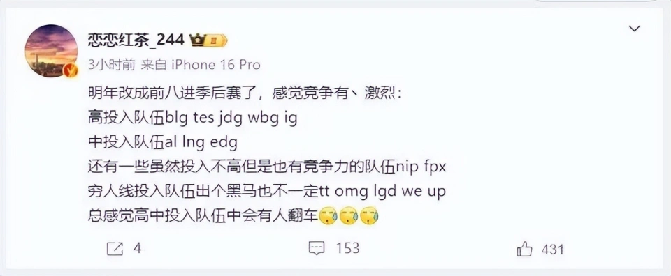 随着12月到来,LOL电竞赛事,立即就要进入收尾颁奖阶段了,咱们LPL一年一度的全明星,也将在本月中旬举行,届时一众明星选手,将会给观众带来表演赛,而在克日,由LEC主持人和欧刚,以及Twitch团结主理的,League Awards年度颁奖典礼,也公布了2024年,具体获奖名单。 环球年度最佳战队、最佳选手、最佳利用,均由T1和Faker斩获,而四大赛区,LCK赛区Chovy,LPL赛区Bin哥,LEC赛区CAPS,LCS赛区Inspired,四人得到的赛区年度最佳选手荣誉,另外的外卡赛区最佳选手,给到了GAM的Levi,另有最佳抢龙和最佳逃生,分别给到了Oner和Zeus。 LPL赛制改革,前8进季后赛来岁的三月份,拳头将举办全新的国际赛事,届时会启用全局BP,每个赛区,有一支战队可以参赛,为了迎合新赛事,各大赛区的赛制,也都必要调解,LEC、LCK都已经公布了,但咱们赛区,现在还没有相关消息,但因为战队总数目的低沉,LPL来岁的季后赛,大概要缩减名额了。 爆料博主恋恋红茶发文透露:LPL来岁,季后赛将改回前8晋级,LPL近来四个赛季,利用的赛制,都是通例赛前10晋级季后赛,如果调解成前8的话,竞争就更加剧烈了,另外红茶还爆料:AL、EDG两支战队,新赛季的投入,跟LNG是差不多的,加上5支强队,根本上是包办季后赛的。 练习赛不敌宝蓝,Zoom怒喷LeyanLOL老头杯半决赛,立即就要打响了,泡芙队和乐言队,将在败者组决赛睁开较量,争取末了一个决赛名额,近来几天,三支战队,都在线下相互约练习赛,Leyan队和宝蓝队的练习赛,乐言队不停输,全程都是被碾压吊打,这也导致队伍氛围变差,老大哥Zoom,更是直接怒喷Leyan。 Zoom在复盘比赛的时间,当着小乐言的面,直接质问:劣势就不语言,打职业也如许吗?你以为我们谁对不起你了,为什么不语言?又不是不能输,昨天输了10把,我们也没说什么啊,但现在如许,就是态度有题目,不外看Leyan第一视角,队友不是没线权就是被单杀,确实没啥说的。 糖小幽为Doinb鸣不平这一届老头杯,丧失最大的选手,毫无疑问是Doinb了,他参加老头杯,是想证明本身的力气,方便转会期找队伍,但没能打进线下,比赛体现也一般,复出肯定是没戏了,加上练习赛和Letme一众选手闹抵牾,Doinb的口碑也受到影响,近来一段时间的直播数据,已经是断崖式的下滑了。 Doinb老婆糖小幽,眼见大B现状之后,也是不由得发声为他鸣不平,糖小幽表现:Doinb是一个很朴拙上进,又懂得感恩和分享的人,但每次都有许多浮名蜚语诽谤他,凭什么这么好的人,要受到这种对待?说实话,Doinb如果不是随处讽刺、蹭热度的话,应该也是不至于沉溺至此的吧。 结语:LPL赛制改革,对于观众来说是功德,因为第九和第十名,季后赛着实都是充电宝,很少有爆冷的比赛出现,新赛季有投资的队伍,也就只有8队,剩下的战队,大部门都是摆烂的,进季后赛也没啥观赏性,还不如低沉数目,给观众提供点有质量的比赛呢。 那么你们以为,Doinb冤枉吗? 接待留言讨论! |