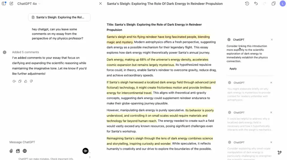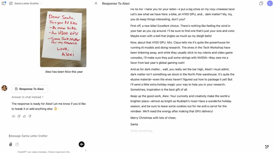 按照惯例,OpenAI 依次向我们演示了新功能的实际应用场景。 比方,让 Canvas 创作一个关于小精灵的圣诞故事,和以往一样,然后让其编辑标题,润色文档,查抄语法,乃至在添加得当的心情符号都能胜任。 会后,OpenAI CEO Sam Altman 也在 X 平台着重提到了这一点:「如今,全部 ChatGPT 用户都可以利用 Canvas 功能,而且可以或许实验代码!更告急的是,它依然可以或许为你的笔墨添加心情符号。」 接着继续给 ChatGPT Canvas 上点强度。 作为物理爱好者,主持人向 ChatGPT Canvas 上传了一篇题为《圣诞老人雪橇:探究暗能量在驯鹿动力中的作用》的论文草稿,然后让 ChatGPT 以物理教授的视角进行评估。 没有出乎太多不测,ChatGPT 很快给出了专业的反馈意见,经过简单的调整后即可呈交给教授审视。 ChatGPT Canvas 的第二项告急更新是支持直接运行 Python 代码。 通过将代码复制并粘贴到 ChatGPT 中,它可以或许辨认代码,并主动切换到代码编辑模式,资助调试或查找错误。用户还可以直接在界面中运行代码,快速辨认任何标题。 假如你是步伐员,在遇上棘手的 Bug 时,不妨当起甩手掌柜,交由它来办理。 据官方先容,OpenAI 在 Canvas 中集成了基于 WebAssembly 的 Python 模仿器,使其可以或许加载绝大多数 Python 库,实现代码的即时运行。 在随后演示环节中,当主持人要求 ChatGPT 制作一个关于圣诞老人制作或分发玩具的桑基流量图,且颜色要符合圣诞主题时,终极成品还是翻车了。 不外,往好点想,最少 Altman 真没拿录播瞎搅我们。 第三项告急更新是将 Canvas 功能引入 GPTs 生态体系。 假设在这个圣诞节,你写信给圣诞老人,许愿清单包罗一辆新自行车、一台 H100 GPU,乃至一些「暗物质」,但圣诞老人因太忙无暇回复,该怎么办? 借助装扮成圣诞老人的 GPTs(即 Santa Letter Drafter)以及新增的 Canvas 功能,该 GPTs 可以或许完善模仿圣诞老人的语气回复信件。 值得留意的是,对现有的 GPTs 而言,Canvas 功能默认处于关闭状态,而新建的 GPTs 则默认开启该功能。假如想在现有 GPT 中启用 Canvas,只需进入设置界面勾选干系选项就好。 发布会的末端依然以一个圣诞笑话作为尾声:「圣诞老人是怎么照相的?答案是,他用 North Polaroid 相机。」 就如今更新的功能来看,ChatGPT Canvas 估计没少在 Claude Artifacts 亦大概 Cursor 等产物上探求灵感,但又更细分的功能选项又多少有些后来居上而胜于蓝。 我也让其撰写了一篇关于灰姑娘和七个葫芦娃的故事。 再好比让其写一个飞机大战游戏,都能乐成运行。 OpenAI 内部员工 Karina Nguyen 也在 X 平台分享了一些实际的应用场景。好比让 ChatGPT 阐释一个数学概念,并编写代码来天生图表,通过视觉辅助来更直观地理解和把握概念。 搜刮 API 文档,引导模子编写并实验代码,以获取所需的图表,亦大概通过 ChatGPT 的 Canvas 轻松编写自己的个性化的小工具或游戏等。 可以说,如今的 ChatGPT Canvas 功能正在朝着 Karina Nguyen 的愿景渐渐迈进: 「我对抱负 AGI 界面的假想,是一张可以或许随人类喜好不停演变和自我调整的空缺画布。它可以或许创新地与人类互动,不停探索新的交流方式,从而彻底改变我们与 AI 以致整个互联网的关系。」 在这当中,AI 代码天生俨然成为了最具应用代价的场景之一。 当下,AI 代码利用率正在渐渐接近 50% 的关键分水岭,这场变革的本质,与其说是服从的提升,倒不如说是对步伐员创作头脑和工作流程的彻底重构。 来自市场的数据也有力印证了这一发展势头。 公开数据体现,预计到 2027 年,全球软件开发市场规模将攀升至 10.39 亿美元,年复合增长率高达 22.54%,而 Cursor 的爆火也反映出 AI 编程工具的大有可为。 作为 AI 编程助手,Cursor 已吸引高出 4 万用户,其年化常常性收入从 2023 年的 100 万美元飙升至 6500 万美元,增长率到达惊人的 6400%。 就在 OpenAI 直播活动召开前,全球首个 AI 步伐员 Devin 也公布正式上线,其服务起价为每月 500 美元,直接融入我们的工作流程,支持在 Slack、GitHub,乃至是私家集成开发情况(IDE 测试版)中利用 Devin。 大模子期间的 AI 编程竞争,焦点不在于代码产出的数目,而在于谁能打造出更完整的开发体验闭环。真正的竞争不是比谁入场更早,而是比谁更懂开发者的痛点。 如今来看,OpenAI 故意以一记精准的发球抢攻,赢下这关键的一分。 |