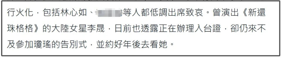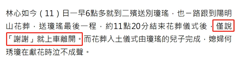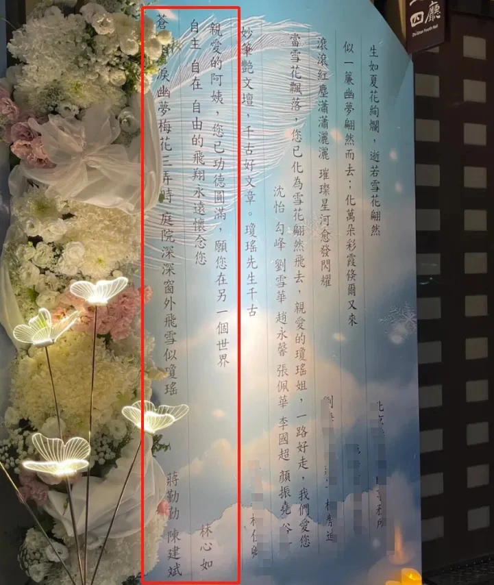 12月11日,琼瑶举行丧礼并下葬,按照琼瑶生前的遗愿,火化后将举行花葬,和丈夫平鑫涛一起长眠阳明山。 花葬现场氛围非常克制,中中午分琼瑶儿子陈中维到达阳明山,现场已经有不少粉丝在期待,送琼瑶末了一程。 按照琼瑶遗愿,她的下葬仪式非常简单,林心如等亲朋也从追思会跟到了下葬现场。 在儿子陈中维将琼瑶安葬之后,各亲朋每人手捧玫瑰花瓣逐个上前送别她,完成琼瑶生前想要的花葬仪式。林心如的站位和眷属并排,献花次序也非常靠前,似乎除了亲人之外,琼瑶和林心如的关系也最密切。送别琼瑶之后,林心如就随琼瑶眷属一起待到末了,面对媒体也仅仅说了一句谢谢,似乎还在消化阿姨离世的伤心。 稍早时间,林心如现身了琼瑶追思会。现场摆设得非常谨慎,鲜花铺地,寓意着琼瑶末了也是在走花路。遗照旁鲜花蝴蝶围绕,像极了她一生作品的缩影,仪式现场还放起了动力火车的歌曲《当》,就像琼瑶所渴望的那样,她像雪花一样翩然离世。 琼瑶儿媳现身追思会戴着口罩也难掩伤心,似乎是担当不了婆婆离世,边走路边掩面哭泣。 火化竣事后上车都需要人搀扶,独子陈中维更是头发斑白,比之前苍老许多,家人去世带给他的打击是巨大的。 林心如一身黑衣心情伤心,面对媒体一声不响,快步走进追思会场。林心如也给琼瑶阿姨留下挽联:“酷爱的阿姨,您已功德圆满,愿您在另一个天下自主、自爱,自由的飞翔永远吊唁您。” 追思会的名字用回了琼瑶的真名陈喆,据台媒报道,娱乐圈不少人固然没能亲临现场,但像陈建斌、秦岚等浩繁明星也送去了花篮以表哀悼。陈建斌和蒋勤勤还写了挽联:“苍天有泪幽梦梅花三弄时,庭院深深窗外飞雪似琼瑶”,涵盖了琼瑶生前的作品。 和林心如相助过《还珠格格》的小燕子也奉上了花篮,留言哀悼琼瑶,写下“悼酷爱的阿姨,流芳千古”。 演过《新还珠格格》的李晟也复兴粉丝,她已经在办理相干手续,预备年后再去看望。 曾经抄袭琼瑶作品的于正,也在网友的询问中复兴,表现做本身四年前已经致歉了,只是微博设置仅半年可见。但更多网友则是直言他不老实,抄袭带给别人的伤害巨大。 只能说往事随风。琼瑶的一生璀璨传奇,她离开着实突然,带给亲朋和读者巨大的震惊和伤心,如今花葬归于尘土,也算告终琼瑶生前心愿,固然琼瑶离开了各人,但她的作品和精力将永远留在人们心中。 |