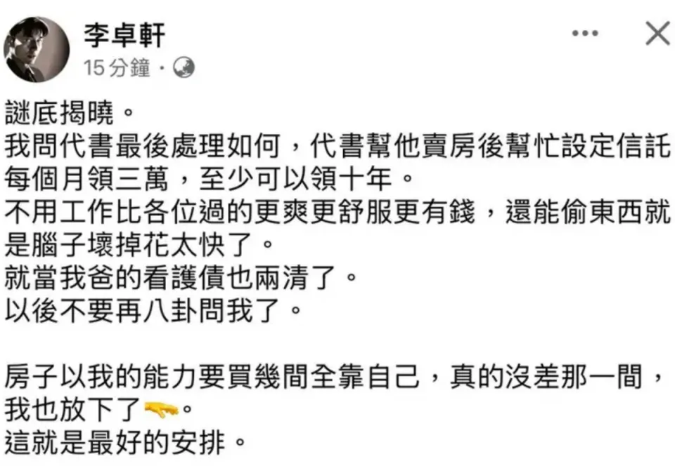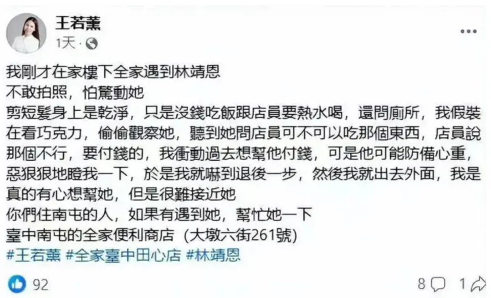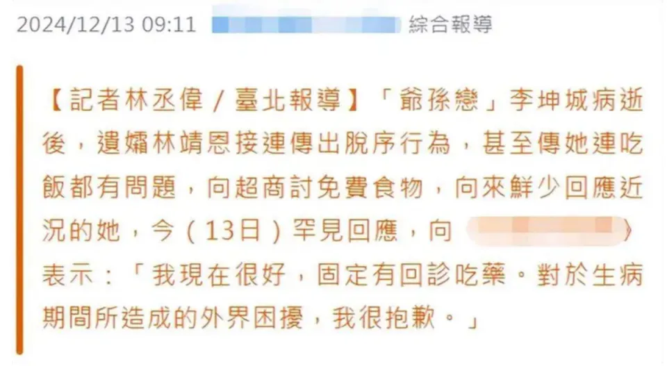 自从李坤城离世后,只有27岁的林靖恩就不绝备受关注。 不能否认的是,身边没了李坤城后,林靖恩频频做出让人不测的行为。台媒对其的报道很长一段时间都指出林靖恩是精神失常,但是无论是本人还是其身边人,都没有人肯定她的精神出现标题。 这一年多,林靖恩多次被曝有偷窃行为, 台湾名流王若薰还曾偶遇林靖恩,并筹划为其提供资助却被拒,因此,林靖恩精神状态受到质疑。 究竟如果不是精神有标题,单凭李坤城留给她的遗产就够她过日子了。 固然李坤城的儿子李卓轩对这个比自己还年轻的继母没有好印象,甚至斥责她无情无义,拿到父亲的遗产后就连告别式都不乐意出席送别末了一程。 但日前李卓轩公开辟文透露,李坤城名下的房子卖掉后不是一次性把钱给林靖恩,而是分期定额以生存费的方式给林靖恩。 卖房的这笔钱通过信托代管,每个月转给林靖恩3万元新台币,至少可以领十年之久。 如果不是大手大脚,这笔固定的生存费完全足够林靖恩的一样平常开销,她也不至于沉溺到现在这种田地,岂非背后尚有原因? 12月13日,台媒致电接洽上了林靖恩,她第一次回应外界关于自己的传闻。林靖恩起首否认自己到超市乞讨食品,但她认可自己确实是抱病了,至于哪个方面抱病了,林靖恩没有多说,只是感谢各人对她的关心,“谢谢各人的关心”。 她也体现自己有回诊吃药,也为自己的脱序行为对社会造成的不良影响致歉,“我很歉仄,抱病期间给外界造成了困扰。” 从林靖恩对答如流的反应来看,她的病情应该不至于如外界所传那般严肃,对话中也可以感觉到她的感情还是非常安稳的。 对于各人关心的有没有居住场所标题,林靖恩透露自己已经回故乡居住了一段时间。固然当年由于执意要跟年长40岁的李坤城在一起,林靖恩与父亲的关系破裂,但现在能回家住阐明父女关系和缓,这样林靖恩也不消漂泊陌头。 有知恋人士透露,林靖恩现在的精神状态还是时好时坏,而造成她的精神出现标题的最主要原因还是无法担当李坤城的离世。 这也是林靖恩父亲最为心痛之处,十年时间,自己的女儿浪费了一生只有一次的芳华年华,如今顶着个遗孀身份成为陌头流离汉,而她实在也只有27岁。 为何偏偏李坤城看上的都是自己的女儿呢?林靖恩的父亲与李坤城是熟悉多年的挚友,由于关系好,所以李坤城经常会到林家做客。 后来林靖恩的姐姐到李坤城身边工作,频仍打仗后,李坤城看上了林靖恩的姐姐。 得知此事的林父格外反对,也乐成制止了两人关系更进一步。没想到李坤城把目的转移到其时年仅17岁的林靖恩身上,单纯的林靖恩在李坤城的甜言甜言攻势下,很快就陷落在其度量。 林父尽力反对,他本以为可以如前次一样虚惊一场,却低估了林靖恩的反叛与刻意。两人掉臂断绝父女关系的威胁,大胆追爱李坤城,为了这段爷孙恋,林靖恩离开家庭十年,结果落下个人去楼空的了局。 林靖恩也确实可怜,奇迹爱情一场空。 盼望她能振作起来向前看,找个时机学习充充电,只有让自己积极起来,爱情和面包终会有的。 |