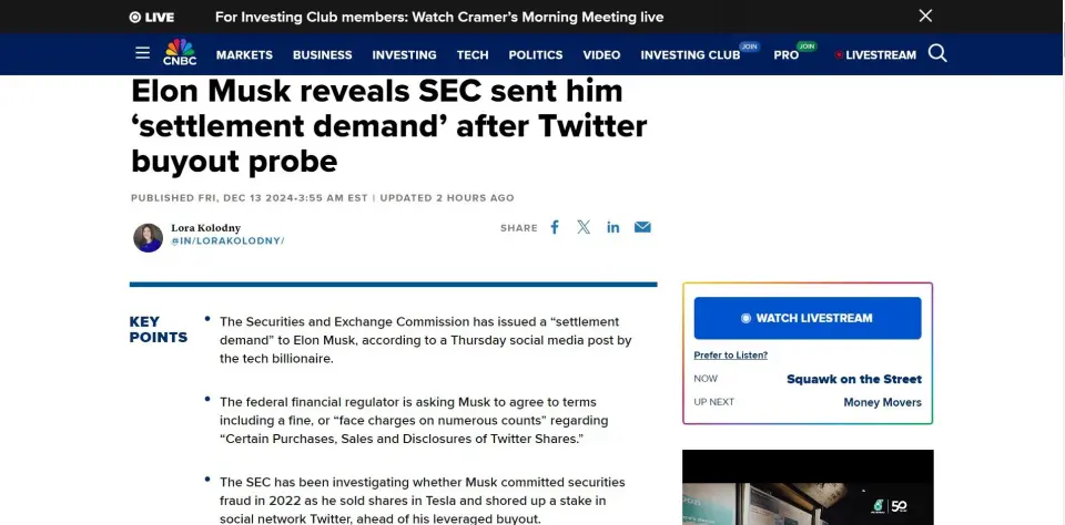 每经编辑:杜宇 本地时间12月13日,全球首富、美国企业家埃隆·马斯克在社交媒体X平台上发文公布,美国太空探索技能公司SpaceX总部将正式迁至美国得州,并将打造新的“星际基地城”。 星际基地(Starbase)位于得州南部卡梅伦县,用来制作并发射重型运载火箭“星舰”。 本地时间12日,SpaceX致信美国父母官员,要求举行民选,将其位于得克萨斯州南部卡梅伦县的工厂基地——星际基地(Starbase)变革为一个新的注册都会。 该基地靠近墨西哥疆域,是SpaceX制造和发射搭载大型星际飞船的猎鹰火箭的基地。据该公司称,这份示威书是由星际基地的居民连合提交的。 据券商中国,星际基地总司理Kathryn Lueders表现,为了培养快速开辟和制造星际飞船所需的劳动力,SpaceX必要将星际基地发展为一个社区。这就是公司请求卡梅伦县举行推举,使星际基地成为一座新都会的缘故起因。 卡梅伦县法官表现,这是SpaceX公司第一次正式提交示威书。本地法律和推举管理部门将检察该示威书,判定其是否符合全部法定要求,然后再接纳举措。 早在2021年,马斯克就曾提出过将星际基地打造成都会的想法。马斯克其时在社交媒体上发帖称,将在得克萨斯州创建星际基地城。 图片泉源:央视消息 (图文无关) 据最新消息,马斯克的SpaceX公司及投资者已告竣购买至多12.5亿美元内部股份的协议,每股185美元的代价远高于不到三个月前每股112美元的估值,增幅到达65%。 SpaceX公司的估值也因此跃升至3500亿美元(约合人民币25000亿元),这使得该公司成为全球最有代价的私人初创公司。 彭博亿万富翁指数表现,停止本地时间12月11日,全球首富、特斯拉CEO马斯克的净资产已达4470亿美元(约合人民币32500亿元),成为全球身家超4000亿美元“第一人”,较居次位的杰夫·贝索斯高出1980亿美元,年初至今累计增长2180亿美元。 自2022年底以来,马斯克的产业发生了戏剧性的变革,其时他的净资产一度下降了超过2000亿美元。但是在特朗普上个月赢得大选后,作为他最大金主,马斯克立刻身价暴增。 值得留意的是,特朗普提名的美国国家航空航天局(NASA)局长贾里德·艾萨克曼也是SpaceX的大股东,他在2021年就向SpaceX投资了2750万美元。 马斯克。图片泉源:视觉中国 另据外媒报道,本地时间12月12日,马斯克的律师亚历克斯·斯皮罗致信即将卸任的SEC主席加里·詹斯勒,控告该机构对马斯克发起了一场“别有动机的举措”,并透露SEC已重启对马斯克旗下脑机接口公司Neuralink的观察。 图片泉源:CNBC报道截图 根据信件内容,SEC要求马斯克在48小时内继承息争协议,付出罚款,否则将面对“多项控告”。这些控告与马斯克2022年收购Twitter(如今的“X”)前的股票投资举动相干,涉及生意业务时间及披露信息的合法性。信中提到,该控告源于一项历时数年的观察,而SEC近期还对马斯克的律师发出了传票,要求其提供证词。亚历克斯·斯皮罗表现,他已明确拒绝共同,并求全谴责该机构的举动具有“政治动机”。 马斯克也在社交媒体上发布了其律师写给加里·詹斯勒的信,配文“加里,你怎么能如许对我”,同时还附上一个哭泣的表情符号。 亚历克斯·斯皮罗还在信件中求明确SEC的举措是由谁指挥的。亚历克斯·斯皮罗强调,SEC对马斯克及其关联公司连续长达六年的“骚扰”已偏离寻求本相的初志,成为一种不合法的施压举动。 如今,SEC对此未予置评。别的,该信件称,SEC还重启了对马斯克旗下脑机接口公司Neuralink的观察。 每日经济消息综合券商中国、公开资料 |