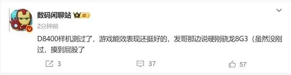 据悉,联发科最新推出的天玑8400芯片,基于台积电4nm工艺打造,旨在寻衅高通骁龙8 Gen3。天玑8400的CPU配置为1个3.25GHz A725+3个3.0GHz A725+4个2.1GHz A725,GPU为Immortalis G720 MC7 1.3GHz。 安兔兔跑分到达了180万以上,高出了骁龙8 Gen2,但未能逾越骁龙8 Gen3,成为联发科至今最强的天玑8系平台。数码闲聊站的博主爆料称,天玑8400的游戏能效表现令人满足。 按照天玑8系的产物定位,搭载该芯片的终端代价通常在2000元以下。REDMI Turbo 4将首发搭载该芯片,REDMI总司理王腾在与米粉互动时暗示,Turbo 4系列新品不会在本月发布,预计将在1月份推出。新品订价预计在1500-2000元之间,有望成为同价位中最强性能的直屏手机,令人期待。 |