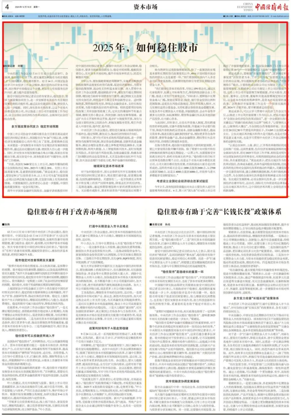 ■中国经济时报记者刘慧 中央经济工作集会12月11日至12日在北京举行。集会强调,做好来岁经济工作,要实行更加积极有为的宏观政策,扩大国内需求,稳住楼市股市。12月14日,中国证监会转达学习中央经济工作集会精力,提出坚持办好资源市场的事,突出维护市场稳固这个关键,更加有力有用服务经济回升向好,着力提拔羁系效能等。 继承中国经济时报记者采访的专家表现,稳住股市,必要多方面政策协同发力,进一步发挥资源市场作为宏观经济发展的枢纽功能作用,通过法治化建设的完善,使投资人信心进一步提振。同时,深化资源市场改革,让这个市场大部分都是优质公司,并以推进上市公司市值管理工作为切入点,设立天下社会经济综合改革试验区,全面深化社会经济综合改革。 01 多方面政策协同发力稳固市场预期 中国上市公司协会学术顾问委员会主任委员黄运成对中国经济时报记者表现,我国股市自“9·24”行情以来,对整个经济发展提振信心的作用已有了显现,灰心感情在扭转。未来要进一步发挥资源市场作为宏观经济发展的枢纽功能作用,通过法治化建设的完善,使投资人信心进一步提振。同时,针对资源市场发展的痛点难点标题,探索出有用的办理方案,落实好党中央、国务院要求的“标题导向、结果导向”工作精力。 “现在,我国有5400家左右上市公司,2022年缴纳的税费占天下税收的近30%,2023年大概是28%。支持上市公司高质量发展,是告急的国家战略。”黄运成表现,稳住股市,要刚强树立“以投资者为本,以上市公司为基”的羁系理念,必须以法律法规为基础支持,在羁系实践上有具体的落实步调。只要步调到位,投资者信心会进一步提振,中国经济高质量发展也肯定会实现目标。 清华大学国家金融研究院院长、金融学讲席教授田轩对中国经济时报记者表现,根据中央经济工作集会精力,稳住股市,要多方面政策协同发力,稳固市场预期,提振投资者信心,优化资源市场结构,提拔市场服从和活力,防范化解潜在风险。 田轩认为,要加强超通例逆周期调治,实行更加积极的财政政策和适度宽松的货币政策,促进经济稳增长,为股市提供政策保障、活动性支持和根本面支持。深入贯彻中央经济工作集会摆设,提高财政赤字率,增长发行超长期特殊国债,增长地方当局专项债券发利用用,通过财政付出直接支持实体经济,特殊是中小微企业和创新型企业。适时降准降息,保持活动性充裕,降低企业融资资源,支持实体经济发展,为股市提供精良的外部情况。特殊是要用好结构性政策工具和创新型政策工具,定向支持单薄环节和重点范畴,继承支持小微企业、科技创新、绿色发展等范畴。通过扩大自主开放和单边开放,稳步扩大制度型开放,深化与全球重要经济体之间的互助,积极发展服务商业,吸引外资进入中国市场,稳外贸、稳外资。 中央经济工作集会提出,要防范化解重点范畴风险和外部打击,稳固预期、引发活力,推动经济连续回升向好。 田轩表现,要守住不发生体系性风险的底线,进一步理顺货币政策传导机制,包管资金渠道流通,创新和改进金融服务,满意公道资金需求;创建多维度风险监测体系,完善预警机制,使用大数据、人工智能等新兴技能,实时发现潜在风险点,并实时进行风险处置;加强金融羁系,构建各部分和谐联动的动态羁系体系,尤其是加强对高杠杆举动羁系,加大违法违规举动惩处力度,维护金融市场的稳固。 02 继承深化资源市场改革 对于怎样稳住股市,国元证券研究所所长助理杨为敩对中国经济时报记者表现,现在要冲破存量,显著增长增量,包罗快速降准降息。其意图有二,一是尽快使名义利率程度和宏观上的资产回报率接轨,降低去杠杆的经济性。二是制造通胀,通过预期管理扭转各人的消费及购房举动。无论楼市或股市,需求和该类资产的财产效应预期非常相干。 杨为敩研究过美股强势的缘故原由,除了不停强劲的宏观根本面和长期的货币政策宽松以外,401k筹划对股市活动性的连续注入也是告急一环。“我们看到现在国内个人养老金可以投宽基指数,背面等待能连续引导更加长期稳固的资金入市。” “我们要深化资源市场改革,尽快让IPO常态化,通过优化审批步调、拓展上市标准等方式,降低科技创新企业上市门槛,推进上市发行节奏常态化。”田轩表现,要降低中长期资金准入门槛,放宽社保资金、险资、银行资金投资比例和范围限制,适度优化风险系数规定,简化市场准入步调,大力发展权益类公募基金,支持私募证券投资基金妥当发展,拓宽各类中长期资金入市渠道,并鼓励险资、企业年金等开展多元化投资,如拓展期权、期货等金融衍生品及其他创新产品投资,强大耐烦资源。 与此同时,田轩表现,应优化外资准入制度,简化跨境投资的审批流程,完善外资服务政策,只管淘汰非必要行政干预,降低外资机构的运营资源,创新金融服务模式,提高生意业务服从;推进互联互通机制连续扩容,增长更多符合条件的股票、债券等金融产品,推动金融期货、期权等衍生品市场的开放,连续吸引跨境资源投资。 在杨为敩看来,稳住股市就要稳住各人的财产预期,不要让各人以为在股市赚不到钱。除了必要中央对股市和经济积极的政策和态度长期稳固、一以贯之外,也必要继承市场真实的信号、凝听市场真实的声音。“稳住股市的目标不应简朴是指数在哪个点位,而是