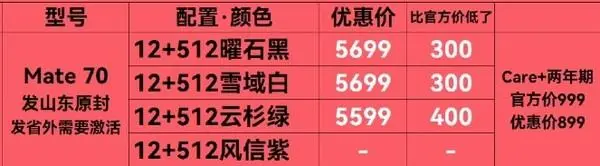 【CNMO科技消息】华为Mate 70系列已经开售一段时间,信任首批用户已经用上了。据CNMO相识,克日有数码博主曝光了Mate 70的最新渠道价,优惠幅度最高为400元,算是一个通例的幅度。此前,该博主曾体现Mate 70标准版的备货量很大,因此渠道价有小幅优惠也在料想之中了。 华为Mate 70系列 从博主放出的图片来看,华为Mate 70标准版12GB+512GB版差别配色的渠道价不尽雷同。此中,曜石黑和云域白的代价为5699元,比官方低了300元。而云杉绿优惠400元,报价为5599元。CNMO还留意到,华为Pura 70系列的渠道价在优惠幅度方面更大,最高高出了2000元,全系最低代价来到了4399元。 华为Mate 70渠道价 CNMO在此附上华为Mate 70系列的售价供各人参考: 华为Mate70: 12GB + 256GB售价5499元 12GB + 512GB售价5999元 12GB + 1TB售价6999元 华为Mate70 Pro: 12GB + 256GB售价6499元 12GB + 512GB售价6999元 12GB + 1TB售价7999元 华为Mate70 Pro+: 16GB + 512GB售价8499元 16GB + 1TB售价9499元 华为Mate70 RS 非凡各人: 16GB + 512GB售价11999元 16GB + 1TB售价12999元 和上一代相比,代价变革最大的是Mate70 Pro+,比上代自制了500元。 |
