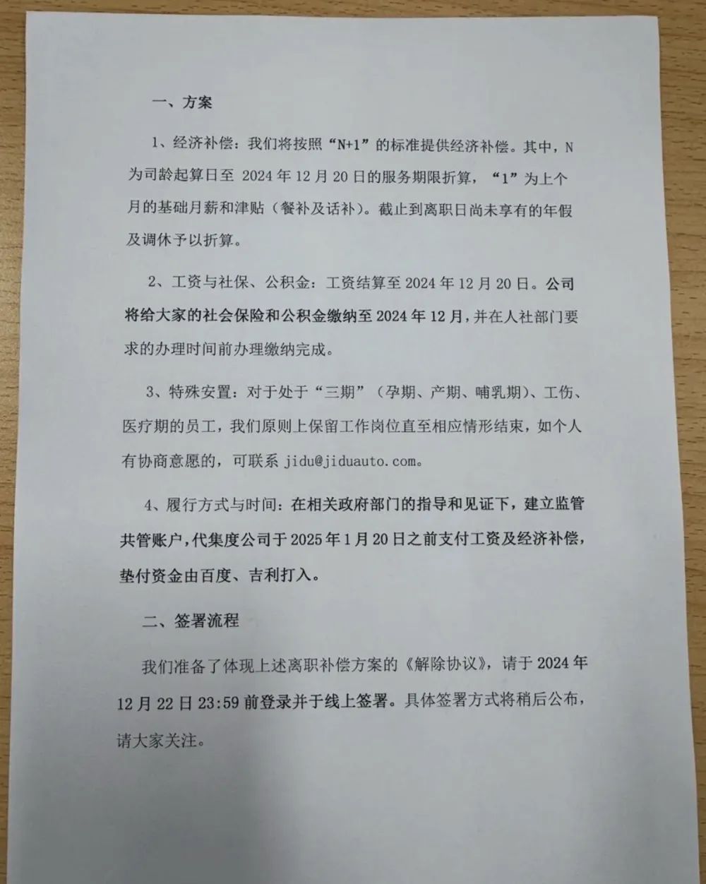 每经记者:孙桐桐每经编辑:孙磊 12月19日,《逐日经济消息》记者获悉,本日下战书3点左右,极越汽车COO罗岗在集越汽车上海总部大厅内,向全体员工公布了员工赔偿办理方案。 “12月的工资和社保(制止到12月20日),以及N+1的经济赔偿,将于2025年1月发放给各人。N为司龄起算日至2024年12月20日。1为上个月的基础月薪和补贴(餐补及话补)。制止到离职日尚未享有的年假及调休予以折算。”罗岗透露,公司现在首先办理员工的问题,由于公司账户现在不安全,以是在政府的羁系下,股东双方建立了共管账户,确保全部员工可以拿到钱。 “假如没有到账,各人可以使用劳动仲裁权益。”罗岗表示,对于孕妇和三期(孕期、产期、哺乳期)等特殊群体来说,也订定了相应的细节。 据罗岗透露,本日几个小时后,公司会发给员工一封沟通信以及详细协议,包括针对每个人的赔偿方案金额的详细算法。 就在同一天,一则极越员工的善后方案文件照片在网上曝光。文件表现,善后方案详细涉及四个方面:1、经济赔偿:将按照“N+1”的标准提供经济赔偿。此中,N为司龄起算日至 2024年12月20日的服务限期折算,“1”为上个月的基础月薪和补贴(餐补及话补)。制止到离职日尚未享有的年假及调休予以折算。2、工资与社保、公积金:工资结算至2024年12月20日。将为员工缴纳社会保险和公积金至2024年12月,并在人社部门要求的办理时间前办理缴纳完成。3、特殊安置:对于处于“三期”(孕期、产期、哺乳期)、工伤、医疗期的员工,原则上保留工作岗位直至相应情况竣事,如个人有协商意愿,可接洽jidu@jiduauto.com。4、履行方式与时间:在相干政府部门的引导和见证下,创建羁系共管账户,代集度公司于2025年1月20日之前付出工资及经济赔偿,垫付资金由百度、祥瑞打入。 此前,有极越员工向记者透露,大部门员工仍未签订离职协议,就是要等终极的赔偿方案。 “你能想到的厂家险些都建了极越招聘群,这周来公司的人少了一些,都在积极找工作。但是并不是全部原班人马都会被聘任,现在仍有大部门员工没有签订离职协议。我们公司差不多有7000多名员工,而每个公司招聘的也就一两百人,再加上年底了就业市场不太乐观。”几天前,一位极越汽车内部员工告诉记者。 此外,制止现在,极越供应商欠款问题并没有办理方案。 根据极越供应商提供的现场视频来看,一位负责人表示:“极越是一家独立运营的公司,而且现在还在运营当中,各人同极越签订的合同,应该去和极越沟通。各人反馈的问题,我们也会反馈给极越。” 逐日经济消息 |