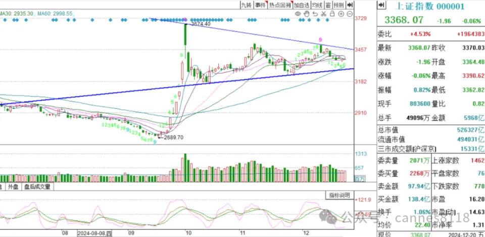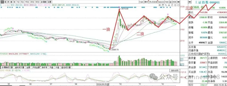 假如A股有跨年度行情,最有大概得环境是主力在12月尾的末了几个买卖业务日偷袭,忽然拉升。 从趋势指标而言,现在大盘是三角形整理结构,但还没有调解到三角形的末端,下周A股大概率还会继承整理,沪指三角形压力在3450点,支持在3300点附近,下周是2024年的末了一个完备买卖业务周,假如下周沪指继承调解,那么沪指在3300附近的时候,会出现反弹。而假如下周调解到位,那么在12月30,31两天的买卖业务日,存在主力忽然拉升,开启跨年度行情的大概。 从波浪理论的角度,沪指从2689到3674点是一浪反弹,从10月8日到现在都是二浪调解。由于一浪反弹了9天,走的太简朴,以是,二浪肯定是走的很复杂,以是,现在大盘在走“之”字型的二浪。汗青上,1999年519行情的一浪结束之后,是调解了半年,才开启了主升浪,这照旧二浪调解时间最短的之一。思量到2025年春节在1月29日,假如1月初主力不能快速拉升,则大盘的主升浪要比及春节之后的2月之后了,以是,我画了一个大盘反弹的门路图,仅供参考。 固然沪指处于二浪调解之中,但是现在市场机会许多,板块轮动显着,特别是AI+已经成为反弹的主线。以是,近来半导体,AI,存储芯片,光刻机,先辈封装,国家大基金持股表现很好。