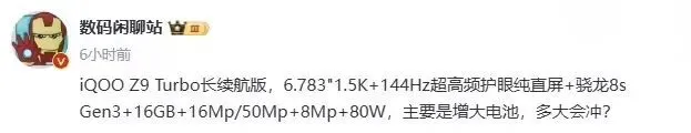博主@数码闲聊站 克日曝光一款 iQOO Z9 Turbo 长续航版机型的主要参数,并称其“主要是增大电池”。 据相识,iQOO Z9 Turbo 将搭载一块 6.78英寸 1.5K+144Hz 超高频护眼纯直屏,处置惩罚器接纳骁龙 8s Gen 3 处置惩罚器 + 16GB内存,配备80W 快充。(泉源:IT之家)