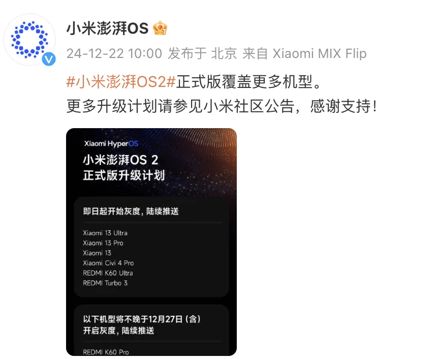 小米之前已经推出了澎湃OS2新体系,由数字系列新旗舰小米15系列手机首发,当然对于没有准备入手新机的用户来说比力关注还是自己的手机什么时间可以升级更新到澎湃OS2新体系,澎湃OS2体系推出后,小米也是也不断在举行其他机型的适配,如今澎湃OS2正式版最新升级计划来了。 根据小米澎湃OS发文表现,小米13 Ultra,小米13 Pro,小米13,小米Civi 4 Pro,REDMI K60 Ultra,REDMI Turbo 3这些机型克日起开启澎湃OS2正式版灰度,一连推送。 而REDMI K60 Pro,REDMI K60会在12 月 27 日 (含) 开启灰度,一连推送。 据官方先容表现每款机型采取行业通用的“灰度到全量”徐徐推送机制,以上展示时间为正式版开放灰度时间,非全量时间。 小米澎湃OS2搭载HyperCore澎湃内核,在性能、图形、网络、安全四大焦点技能上实现突破,为用户带来更好的利用新体验。 |
