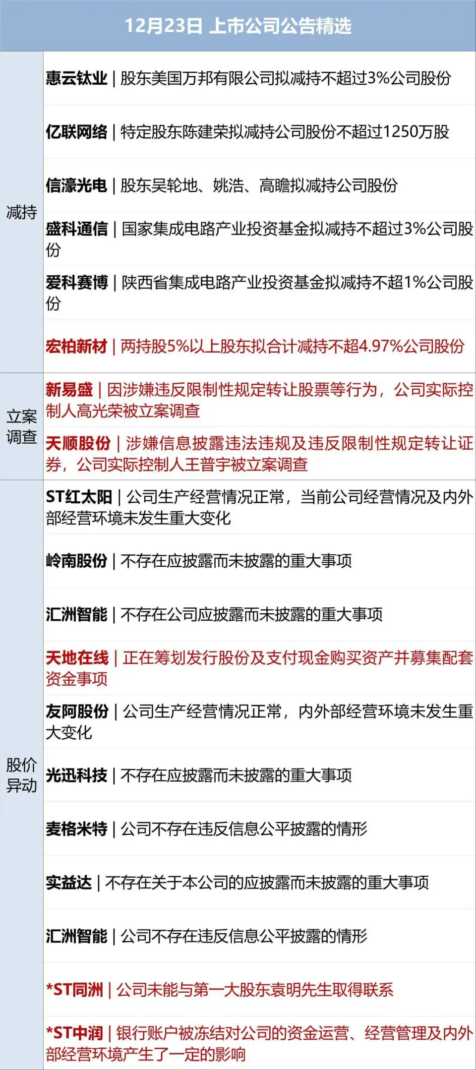 每经编辑:陈鹏程,袁东 NO.1上海地铁11号线遭吊车侵入受损区段部分规复运营 22日上午由于外部工地吊车施工侵入线路导致受损的上海地铁11号线区段,已于当日21时30分左右部分规复运营。上海地铁方面表现,颠末尽力抢修,11号线受损区段于21时30分左右规复开通运营,先行开通陈翔公路站至迪士尼站方向。记者在陈翔公路站看到,21时30分左右,从陈翔公路站开往迪士尼站方向的列车开出,车站内秩序井然,车辆颠末事故地区时运行平稳。22日8时左右,上海地铁11号线马陆至武威路站区间,由于外部一施工工地履带吊车坍毁侵入,造成地铁线路装备和一列正常运行的地铁局部受损,未造成职员伤亡。(新华社) NO.2 “女子实名举报前公公” 农发行转达 12月22日,中国农业发展银行湖北省分行就“女子实名举报前公公有巨额不明财产”一事发布情况转达,经核查,未发现徐某取得资产存在违纪违法活动,也未发现徐某存在家庭巨额财产来源不明的标题。(央视消息) NO.3个人养老金理财全部斩获正回报 Wind数据表现,制止12月19日,全市场存量个人养老金理财产物建立以来匀称净值增长率为5.54%,匀称年化净值涨幅为3.64%,且全部斩获正回报。受访人士表现,在钱币、财务两宽情况中,未来个人养老金理财投资情况依然较好,并发起通过投资权益等多元化资产配置,不断提拔收益潜力。(中国基金报) NO.4涉事企业回应克制员工去冰雪大天下 12月21日,一则黑龙江某企业发布的《关于春节前克制员工前去冰雪大天下嬉戏的关照》在网络引发关注。22日,记者致电涉事企业,该企业负责人周老师证实该《关照》内容属实。周老师表现,如今暂未关注到有员工对《关照》提出贰言,如果有员工提前买到了冰雪大天下的门票,因《关照》无法前去,可以向企业申请报销。(央广网) NO.52024年贺岁档影戏票房破20亿 据网络平台数据,制止12月22日16时17分,2024年贺岁档(11月22日—12月31日)档期影戏票房(含预售)突破20亿。 (央视消息) NO.6天下铁路2025年1月5日实验新的列车运行图 据“中国铁路”公众号消息,1月5日零时起,天下铁路将实验新的列车运行图。调图后,天下铁路安排图定游客列车13028列,较现图增长230列;开行货品列车22859列,较现图增长91列。 NO.7国际消息 是否会有三战?普京回应 当地时间12月22日,全俄国家电视广播公司发布对俄总统普京19日在记者会后的采访。当被问及第三次天下大战是否已经开始,普京表现,“没有须要恐吓任何人”。伤害有很多,而且在不断增长。俄罗斯看到了对手所作所为。对手正在升级局面。如果俄罗斯的对手想让局面升级,那就随他们去,但俄罗斯将始终应对任何挑衅。当俄罗斯如今的对手和大概的合作同伴终极听到这一点、明确这一点、意识到这一点时,他们就会明确有须要寻求妥协。俄罗斯乐意寻求妥协,但俄罗斯的长处不能受损。(央视消息) 巴西飞机坠毁事故机上10人全部确认死亡 一架飞机当地时间22日上午在巴西南里奥格朗德州的格拉马多坠毁,根据巴西接济团队和该州州长的报告,机上共有10人,无人幸存。此前有消息称,机上搭载有3人。事故发生时,飞机分别撞上了一栋建筑、一家家具店和一家旅馆的烟囱,造成至少15人受伤,伤者被就近送往医院。据悉,这架小型飞机于当地时间上午9时15分左右腾飞,在腾飞几分钟后在格拉马多坠毁。 (央视消息) NO.1A股现多起备案观察 新易盛(SZ300502,股价128.65元,市值911.88亿元):12月22日,新易盛公告,公司控股股东、实际控制人、董事长高光荣于2024年12月20日收到中国证券监督管理委员会签发的《备案关照书》,因“涉嫌违背限制性规定转让股票”等活动被备案观察。 豆神教导(SZ300010,股价8.47元,市值175.04亿元):12月20日,豆神教导公告,公司于克日收到中国证监会《备案告知书》,因涉嫌信息披露违法违规,中国证监会决定对公司举行备案。 金花股份(SZ600080,股价8.01元,市值29.90亿元):12月20日,金花股份公告,公司董事长邢雅江于2024年12月20日收到中国证监会下发的《备案告知书》,因涉嫌信息披露违法违规,中国证监会决定对邢雅江举行备案。 莫高股份(SH600543,股价5.93元,市值19.04亿元):12月20日,莫高股份公告,公司董事长杜广真收到中国证监会出具的《备案告知书》,因涉嫌黑幕交易,中国证监会决定对杜广真予以备案。 天顺股份(SZ002800,股价12.13元,市值18.47亿元):12月22日,天顺股份公告,公司实际控制人王普宇于2024年12月20日收到中国证监会下发的《备案告知书》,因王普宇涉嫌信息披露违法违规及违背限制性规定转让证券,中国证监会决定对王普宇备案。 新迅达(SZ300518,股价12.42元,市值24.77亿元):12月20日,新迅达公告,公司及实际控制人吴成华于2024年12月20日分别收到中国证监会下发的《备案告知书》。因涉嫌信息披露违法违规,中国证监会决定对公司及吴成华备案。 NO.2胖东来将部分商品临时调解为线上贩卖 胖东来:据许昌日报社公众号“许昌时刻”消息,12月21日,胖东来超市又公告新措施,将部分商品调解为线上贩卖。公告内容表现,因近期胖东来卖场客流量较大,部分商品出现连续哄抢现象,为了保障卖场运营安全及顾客人身安全,引导顾客理性消耗,自2024年12月21日起,DL洗衣液系列、DL精酿啤酒系列、DL压榨一级花生油系列、DL黑豆酿造酱油(生抽)临时调解为线上贩卖。 点评:胖东来超市通过调解部分商品为线上贩卖,旨在应对