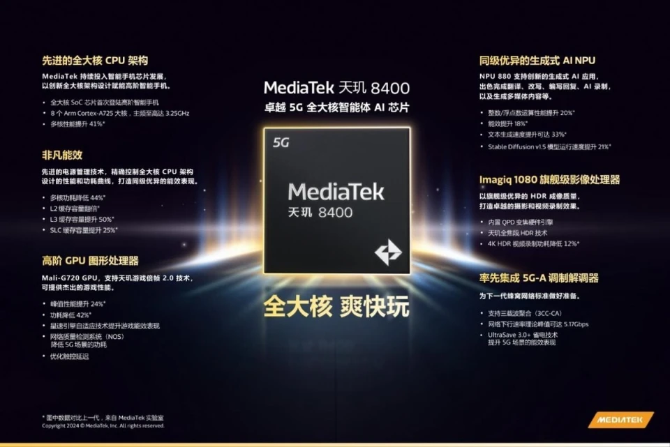 12月23日,联发科全新次旗舰芯片天玑8400正式发布。其所接纳的Mali- G720 MC7 GPU和对各种端侧AI体验的支持,令游戏玩家和AI重度用户眼前一亮,但天玑8400最吸引消费者的依然是全大核架构。 2023年,在手机SoC广泛接纳大小核,乃至超大核+大核+小核筹划之时,联发科天玑9300就率先接纳全大核筹划,将行业带入了全大核期间。2024年10月,联发科新款旗舰SoC天玑9400来袭,基于第二代全大核架构,在单核性能提升35%,多核性能提升28%的同时,能效也大幅升级,60帧模式下运行《原神》《星穹铁道》等大型手游,功耗均不到4W。 在联发科的带动下,部门手机SoC厂商紧随厥后,旗舰SoC也选择了全大核架构筹划。不外,之前基于全大核架构的SoC根本为旗舰芯片,而现在天玑8400的到来将全大核筹划带到了次旗舰SoC范畴。 据联发科先容,天玑8400的8颗核心全部为Crotex-A725,此中1颗频率为3.25GHz,负责高负载场景;3颗频率为3.0GHz,负责对于中高负载场景,4颗频率为2.1GHz,负责低负载场景。得益于全面提升的全大核筹划,天玑8400单核性能提升10%,多核性能提升41%,多核能耗低落44%。 已往手机SoC选择大小核筹划,根本缘故因由在于CPU核心架构、制程工艺、优化技能落伍,大核心在低负载场景下难以有效低落功耗和发热,因而必要专为低负载场景开辟能效核心(小核心)。颠末多年时间发展,各项技能飞速进步,不光核心架构和优化技能全面升级,天玑8400更是接纳了极为先辈的台积电4nm制程工艺,令芯片的能耗和发热体现大幅提升。 另一方面,手机SoC性能的提升,也给了软件开辟者偷懒的时机,不消费心费力优化App。正因云云,App愈发痴肥,对于性能的要求也越来越高,传统的小核心乃至在一样平常利用场景下,都大概出现性能不敷并造成卡顿的情况,每当此时体系就必要调用大核心,反而会导致功耗飙升。种种因素叠加,就导致小核心渐渐显现出无力感,可以或许发挥的作用越来越小。 反而是大核心因性能强大,一样平常利用性可以或许用,且无需频仍在大小核心之间切换,可以或许一定程度下镌汰SoC的功耗。全大核架构的筹划,还可以进步SoC的性能上限,例如在散热模组更强的平板电脑上,就可以长时间性能全开,畅玩大型手游。 天玑9300、天玑9400两代旗舰SoC已证实了全大核筹划的领先,其他厂商的跟进,则进一步凸显出联发科对于行业的洞察力和前瞻性。现在,联发科不屈不挠,将全大核架构带到了轻旗舰和中端市场,或将改写2000元-4000元价位手机的游戏规则。大概在来岁,2000元以上的安卓手机,搭载非全大架构SoC的机型将所剩无几。 |