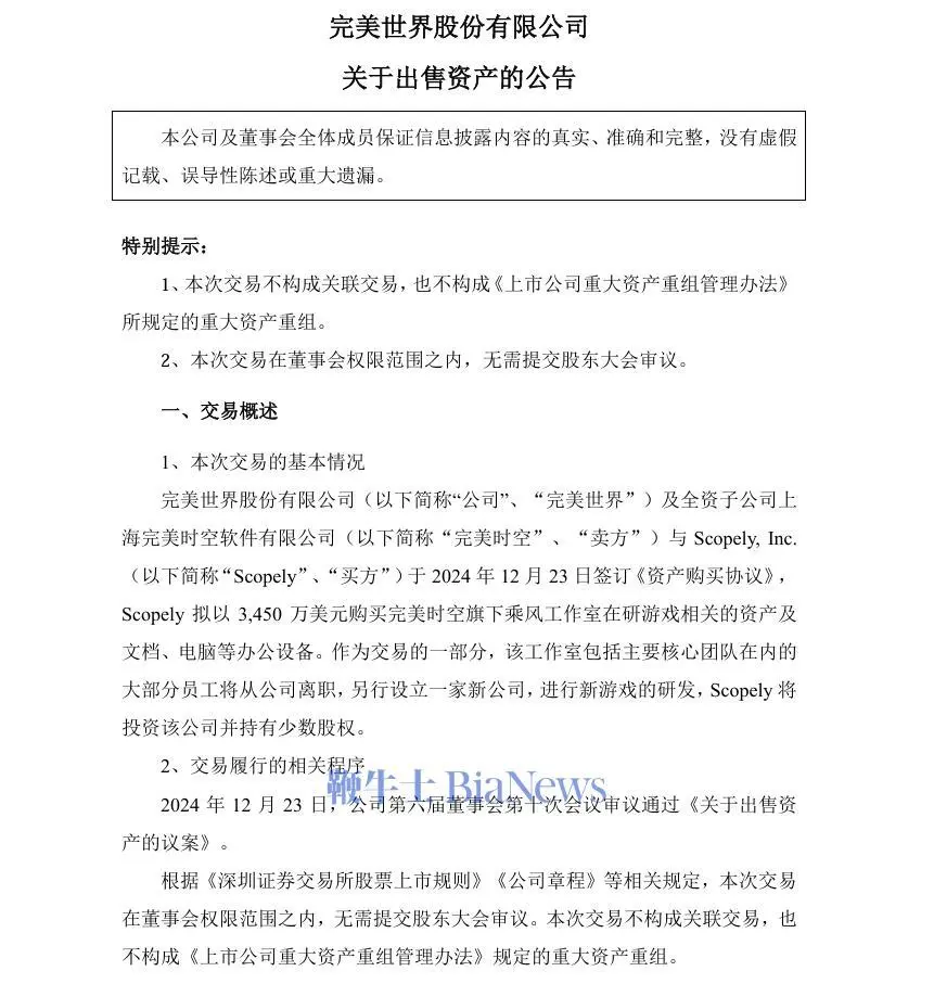 鞭牛士 12月23日消息,完美天下公告,公司及全资子公司完美时空与Scopely于2024年12月23日签署《资产购买协议》,Scopely拟以3450万美元购买完美时空旗下乘风工作室在研游戏干系的资产及文档、电脑等办公装备。作为生意业务的一部门,该工作室包括紧张核心团队在内的大部门员工将从公司离职,另行设立一家新公司举行新游戏研发,Scopely将投资该公司并持有少数股权。 公司将根据标的员工在完美天下任职时间及干系法律法规,向该等员工付出驱逐费。 乘风工作室建立于2020年,现在紧张工作是继承互助方委托,负责公司《代号PIE》游戏的开发。预计本次生意业务对归属于上市公司股东的净利润产生的净影响约为1.2亿元,拟转让的办公装备账面价值约为100万元。 |
