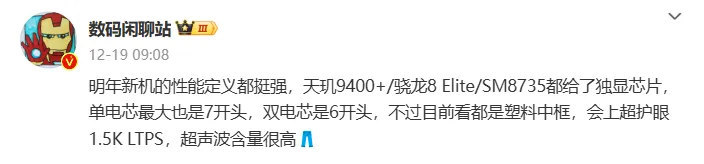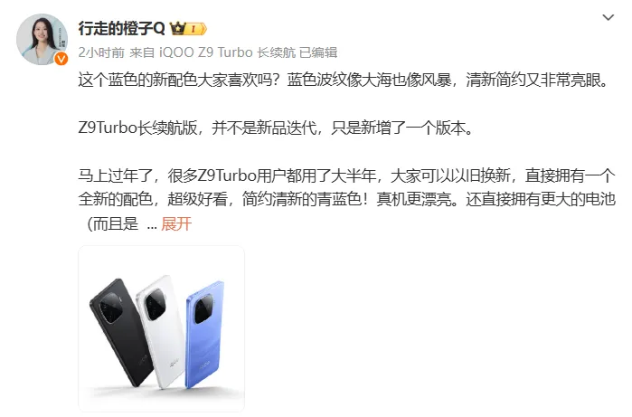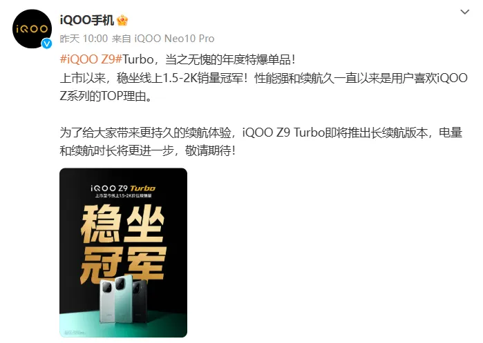 本年4月,iQOO Z9 Turbo手机正式上市,售价1999元起。 日前,iQOO手机官方宣布,iQOO Z9 Turbo上市以来,稳坐线上1.5-2K销量冠军。 同时,官方表示,为了带来更恒久的续航体验,iQOO Z9 Turbo即将推出长续航版本,电量和续航时长将更进一步。 本日,官方宣布,iQOO Z9 Turbo长续航版开启预约,限量抢至高代价2220元购机惊喜欢礼,1月见。 联合海报图来看,iQOO Z9 Turbo长续航版提供黑、白、蓝三款配色可选,整体筹划与尺度版保持同等。 同时,据iQOO 产物司理邢程透露,iQOO Z9 Turbo长续航版并不是新品迭代,只是新增了一个版本;长续航版拥有更大的电池,且不影响手感,根本维持原有重量厚度下的最大容量。 作为参考,iQOO Z9 Turbo提供山野青、星芒白、曜夜黑三款配色可选,接纳旗舰同源金属舷窗筹划,等深四曲后盖,直边中框,整机厚7.98mm,重194.9g。 屏幕方面,iQOO Z9 Turbo配备144Hz华星C8旗舰屏,6.78英寸1.5K柔性直屏,144Hz革新率、3840Hz高频PWM调光、局部峰值亮度4500nit。 性能方面,iQOO Z9 Turbo搭载第三代骁龙8s移动平台、全新“独显芯片 Turbo”,接纳6K天幕VC液冷散热,6043mmVC均热板。 iQOO Z9 Turbo支持《王者光彩》120帧+极致画质模式、搭载移动端光线追踪技能、《元梦之星》120FPS超帧模式及原画模式;通过KPL比赛用机测试认证。 影像方面,iQOO Z9 Turbo前置1600万像素摄像头,后置5000万像素LYT-600主摄,联合800万像素超广角镜头,全像素全向对焦、OIS光学防抖技能加持,另有活动摄影、质感色彩、蓝厂人像、边框水印、鱼眼殊效、韶光慢门等功能。 电量快充方面,iQOO Z9 Turbo内置6000mAh超薄蓝海电池,支持80W闪充。 其他方面,iQOO Z9 Turbo接纳封闭式立体双扬声器、X轴线性马达,支持NFC、红外遥控、IP64防尘防水,搭载OriginOS 4体系。 售价方面,iQOO Z9 Turbo,12+256GB版本售价1999元、16+256GB版本售价2299元、12+512GB版本售价2399元、16+512GB版本售价2599元。 别的,博主@数码闲聊站 此前的一份爆料中提到了iQOO来岁的新机规划。 该博主表示,iQOO来岁新机的性能界说都挺强,无论是天玑9400+机型、骁龙8 Elite机型还是SM8735机型,都将配备独显芯片。 同时,该博主透露:“单电芯最大也是7开头,双电芯是6开头”。 也就是说,来岁iQOO手机的电池容量根本都在6000mAh以上。 除了主打性能和续航体现外,全部机型都会配备超护眼1.5K LTPS屏幕,而且超声波含量也很高。 不外,现在来看这些手机都是塑料中框筹划,感爱好的朋侪可以保持关注。 |