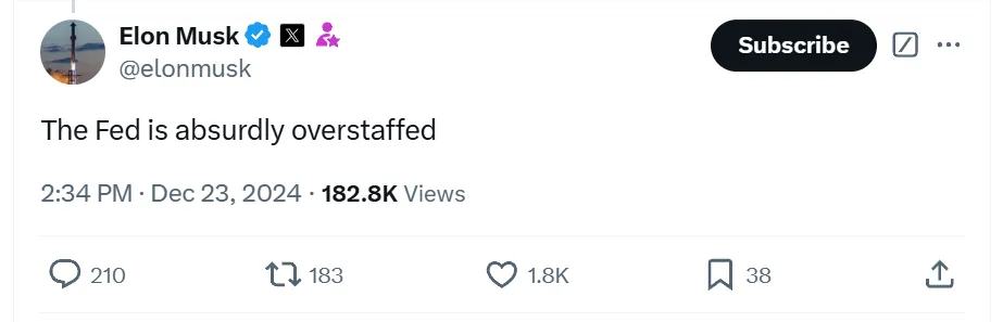 差点把美国政府搞后,世界首富马斯克又盯上了美联储。 据彭博社报道,当地时间22日,马斯克在社交媒体“X”上发帖表示,“美联储职员严峻过剩”,但没有做更多解释。他的这一表态,是对一则关于美联储最新钱币政策的贴文的留言。