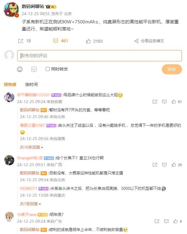 12月25日消息,数码博主@数码闲聊站爆料一台子系新机资讯,子系新机正在测试90W快充+7500mAh电池,屏幕形态为纯直屏,厚度和重量还行。 同时博主提到:母品牌暂时没有开7开头的方案,等等看吧:该机现在没有长焦方案,大概率这种性能机都是只堆主摄;顺遂的话就是来岁上半年,不顺遂就砍容量。 结合品评区内容,预计该机为REDMI旗下机型。现在,REDMI品牌推出的机型中,电池容量最高是REDMI K80,配备6550mAh最巨细米金沙江电池,充电功率为90W,不支持无线充电功能。 编辑点评:综合来看,REDMI这款新机核心竞争力在于性能体现与续航本领,而这类中端性能机的影像体现一般较为孱弱。在现在已经发布的机型中,还没有出现90W快充+7500mAh电池如此强盛的续航组合,如果REDMI能顺遂拿出这一套组合,将会再次搅动中端市场,迎来一波新的消耗高潮。 随着电池容量的比庞大于快充,来岁子系迭代新机的快充也会缩,120W机子会越来越少。那么各人以为现在是应该继续进步电池容量,照旧不牺牲太多电池容量重新转向快充呢?欢迎在品评区讨论哦! |