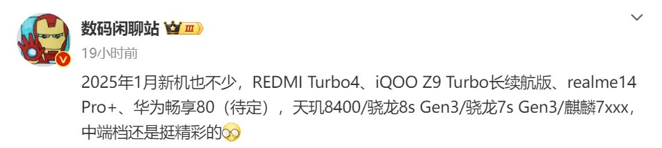 间隔2025年还有不到一周的时间,有爆料表现,各大厂商将在开年之际献出自家的中端系列新机。 据博主@数码闲聊站 发文透露,包括小米 REDMI Turbo 4、iQOO Z9 Turbo 长续航版、realme 真我 14 Pro+(华为畅享 80现在处于待定状态)等多款新机将于2025年1月到来。 同时,该博主还曝光了上述新机的性能参数。 分别为天玑 8400(预计对应小米 REDMI Turbo 4)、骁龙 8s Gen3(iQOO Z9 Turbo 长续航版)、骁龙 7s Gen3(真我 14 Pro+)和麒麟 7xxx(华为畅享 80)。 小米 REDMI Turbo 4 克日,一款型号为24129RT7CC的小米新机通过了3C认证。相干推测以为这款新机为REDMI Turbo 4。 参考此前爆料,REDMI Turbo 4的电池容量将凌驾6500mAh,并搭载1.5K LTPS技术的窄边框护眼直屏,采取纤薄玻璃机身搭配塑料中框,配备短焦光学指纹,左上角设置了简约的竖排双摄体系,主摄像头像素为5000万。 在前两天的天玑8400全大核智能体 AI 芯片的发布会上,REDMI总司理王腾预热了REDMI Turbo 4手机。 别的,王腾此前还曾发文称:“从年初REDMI的产物线就已经在调解,新的K系列定位冠军旗舰,尤其Pro要打造万能旗舰,代价档位会上探,承接小米数字涨价之后的空档,将来2-3K会由Turbo系列来承接。” 由此来看,REDMI Turbo 4的价位大概在2~3000之间。 iQOO Z9 Turbo长续航版 日前,iQOO手机官方公布,为了带来更恒久的续航体验,iQOO Z9 Turbo即将推出长续航版本,电量和续航时长将更进一步。 现在新机已经上架并开启预约。 联合预热海报图来看,iQOO Z9 Turbo长续航版提供黑、白、蓝三款配色可选,团体计划与标准版保持同等。 新机搭载的处理器、屏幕、影像、快充参数与标准版机型保持同等,重点升级了电池容量,并根本维持了前代机身的重量和厚度。 作为参考,iQOO Z9 Turbo厚7.98mm,重194.9g,配备6.78英寸1.5K柔性直屏;搭载骁龙8s Gen3处理器、全新“独显芯片 Turbo”,采取6K天幕VC液冷散热,6043mmVC均热板。 前置1600万像素摄像头,后置5000万像素主摄+800万像素超广角镜头;内置6000mAh超薄蓝海电池,支持80W闪充,起售价1999元。 realme真我14 Pro+ 联合近期预热,真我14 Pro+环球首发温度感应变色技术,提供珍珠白配色。 当温度小于16摄氏度的时间,手机后盖颜色会从白色酿成饱和度更高的蓝色,出现出蓝白交错的水波纹图案,温度升高后颜色规复正常。 其他设置方面,真我14 Pro+配备1.5K全等深四微曲全面屏,拥有93.8%超高屏占比,边框宽度仅1.6mm;后置5000万像素主摄、5000万像素3X IMX882潜望长焦和800万像素超广角。搭载高通骁龙7s Gen3处理器,支持80W闪充、IP68和IP69满级防尘防水。 另外,新机还配备了“MagicGlow”闪光灯体系,可在弱光条件下出现自然肤色,官方称其是环球首款三颗双色温闪光灯手机。 综合来看,有多款中端新机将率先在2025年1月发布,届时消耗者将有着更多的选择性。相干机型的现实设置怎样,大家可以保持关注。 |