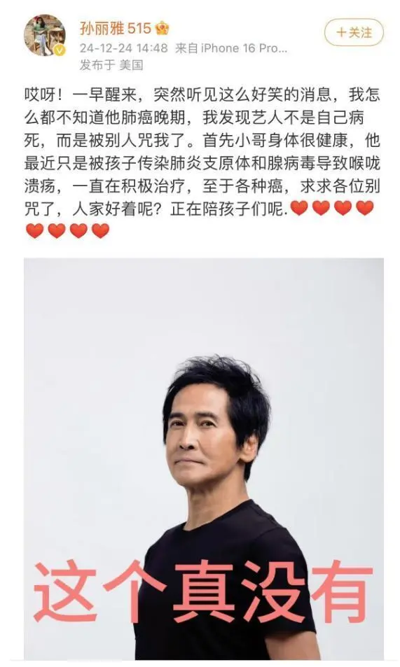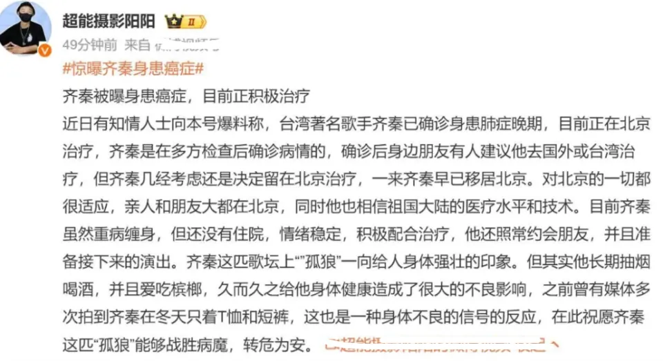 12月24日,眷属否认齐秦患癌,并透露齐秦此前只是患平凡感冒,现在已病愈,正在云南练高尔夫。其妻子孙丽雅发文体现齐秦身段很好,最近只是被传染导致喉咙溃疡,还喊话:“至于各种癌,求求各位别咒了,人家好着呢?正在陪孩子们呢。” 除此之外,孙丽雅还在品评区透露,“小哥说,他已经去火化场路上了,小哥问你们满足吗?”作家饶雪漫也转发该干系动态称:这个真没有!齐秦公司这边也发文体现,他们会追究造谣和散布者的法律责任,请各人善意发言。 此前,多名狗仔发文爆料,称齐秦身患癌症,是肺癌晚期,现在正在北京治疗,还说齐秦是在多方查抄后确诊病情的,并决定留在北京治病。狗仔还透露,齐秦看上去身段不错,但多年来恒久吸烟喝酒爱吃槟榔,因此对身段康健造成影响。 爆料一出,刹时引起网友热议,不少网友都信以为真,在品评区疯狂刷屏,盼望齐秦能够早日病愈。尚有网友则感慨他年事并不大,患上肺癌晚期好惋惜。 而就在网友热议之际,齐秦眷属等多方纷纷发声辟谣,让无数歌迷和关心齐秦的网友们都松了一口气,终于放心了。 随后许多网友便指责狗仔造谣他人患癌的举动着实是可耻,有人直接怒斥狗仔丧本心,直言应该把他们给抓起来。 确实,看狗仔之前的爆料,说得有鼻子有眼的,很难不让人错信,只能说现在的一些狗仔也太太过了,人家齐秦只是感冒,却传人家是肺癌晚期,造谣程度也太离谱了,也难挂蛛秦妻子会那么生气,试想换作任何一个人被造谣得了癌症都会很愤怒的吧? 值得一提的是,齐秦还将在12月31日现身北京国家速滑馆加入跨年演唱,演唱会主理方也发声辟谣,并贴脸开大直接点名狗仔,让其善意发言。 据悉,今年64岁的齐秦是中国台湾省着名歌手,代表作有《狼》《约莫在冬季》《不让我的眼泪陪我留宿》《无情的雨无情的你》《外面的世界》等。 而提到齐秦,许多人也会想到王祖贤,二人当年爱得轰轰烈烈,分分合合许多次,最后却依然是以分开告终,闹得不欢而散。齐秦现在的妻子孙丽雅比齐秦小24岁,父亲是一位地产商。二人于2010年完婚,婚后感情一直很好。 |
