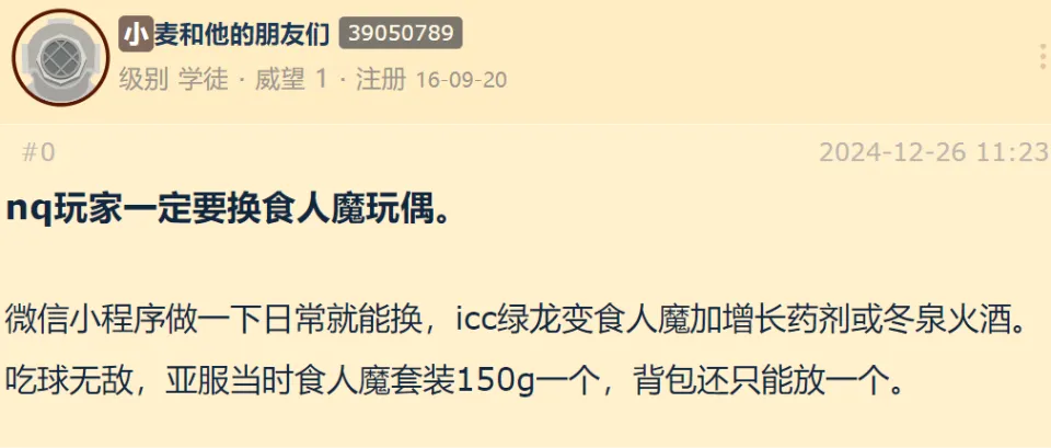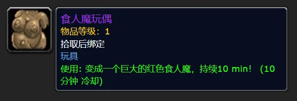 来自NGA玩家的分享,现在小步伐打卡任务夸奖的食人魔玩偶是ICC打绿龙吃球的好东西。变食人魔之后再吃增长药剂/冬泉火酒,体型变大后吃球无敌。之前在亚服什么人套装都卖到150G一个了,而且照旧唯一的。 食人魔玩偶利用之后可以变身成为一只食人魔,连续10分钟,CD也是10分钟,这意味着可以无限变身。 |